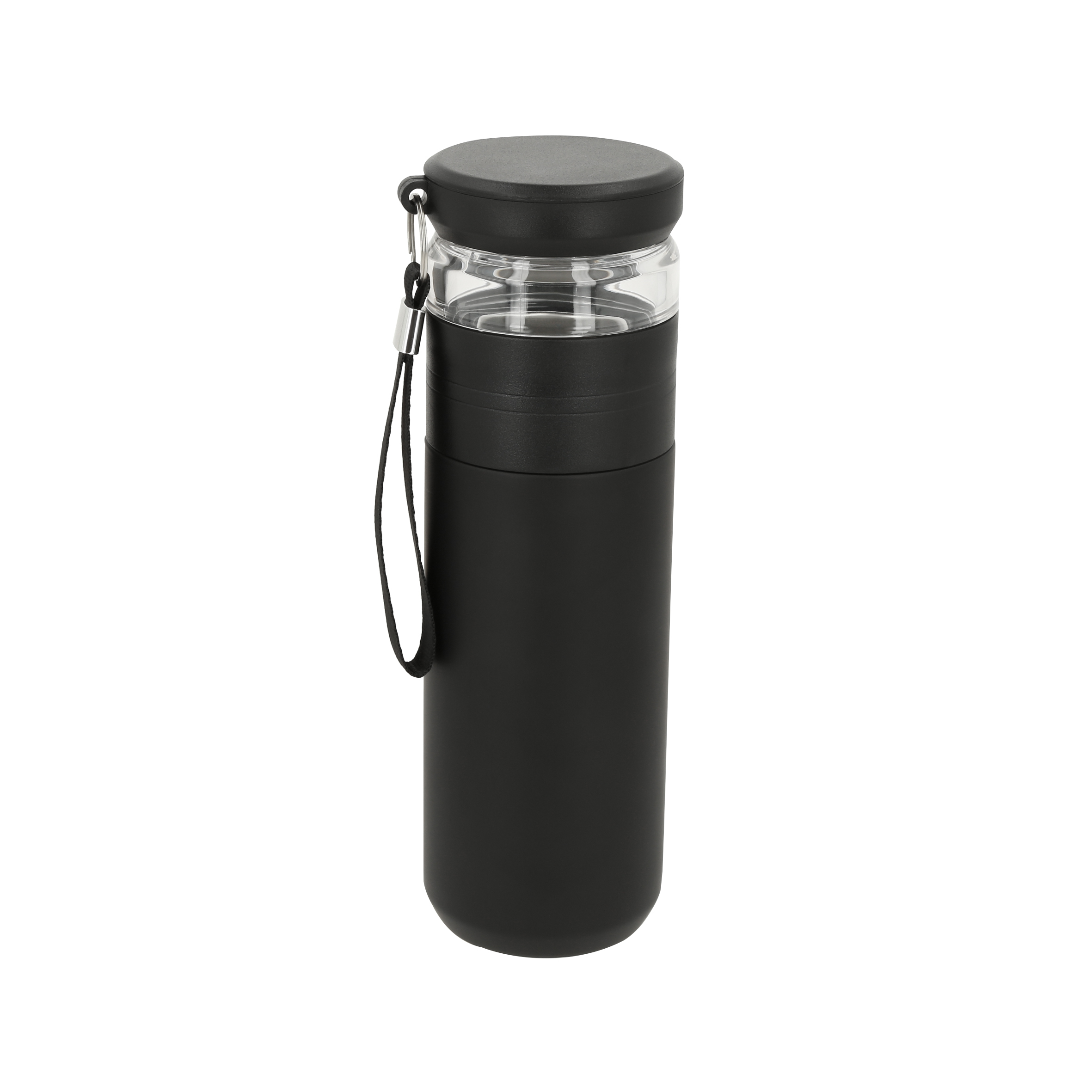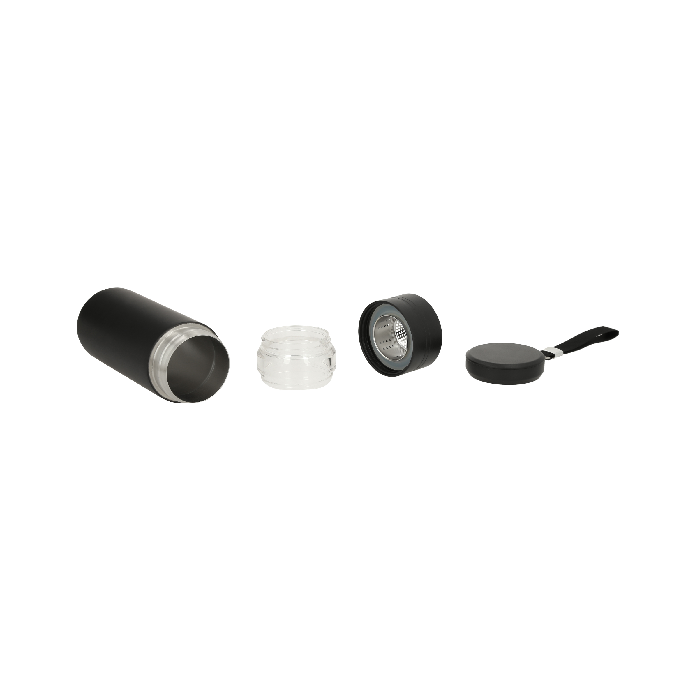 Termo con doble pared de acero inoxidable, rejilla para infusor, taza de plástico y correa.
