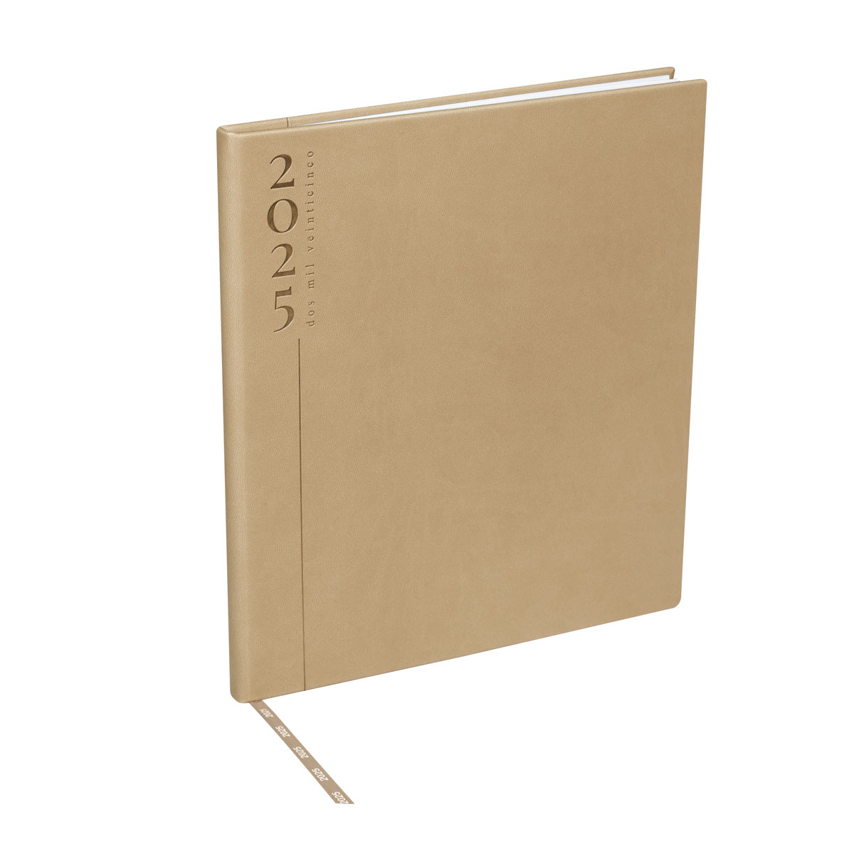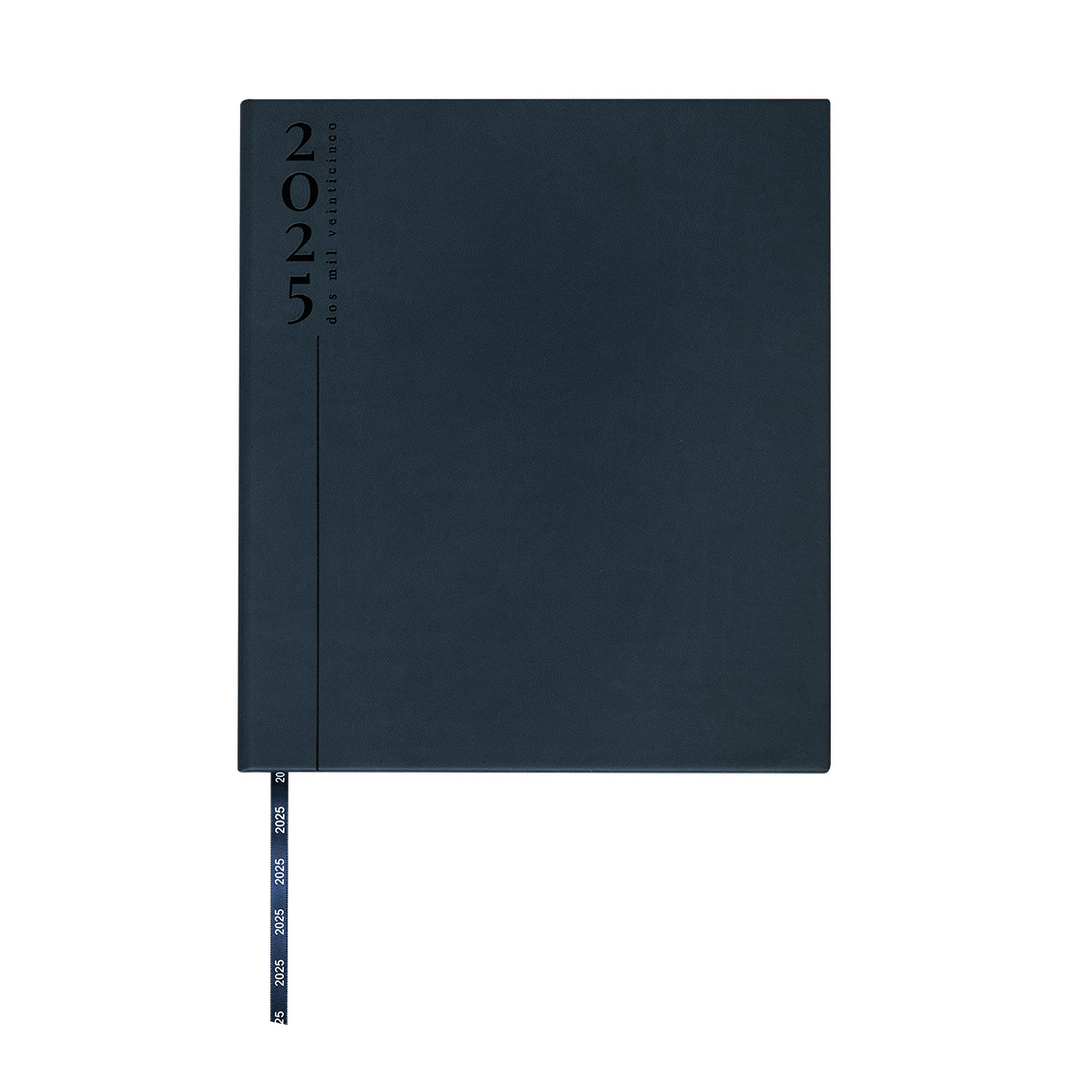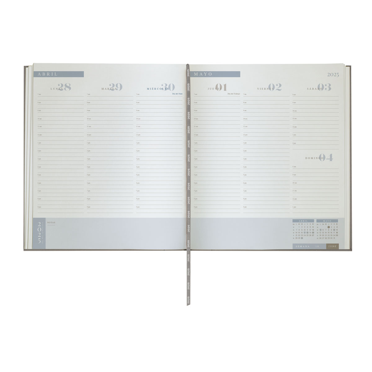 Agenda semanal con 80 hojas. Contiene datos personales, calendarios 2024-2025-2026, planeador 2025, presupuesto de gastos, seguimiento de nuevos hábitos, organizador de tareas, planeador de proyecto y días festivos. Incluye caja individual.