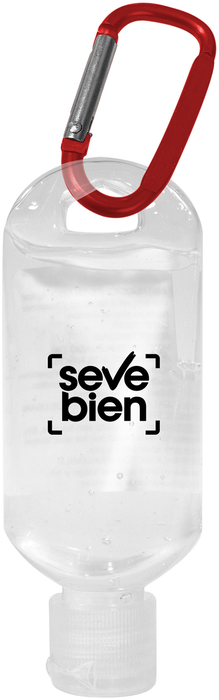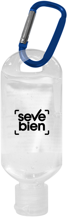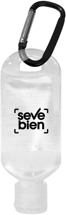 11,5 x 4,5 cm. Plástico. Alcohol en gel en botella transparente con tapa y gancho carabinero de color. Fácil de usar: aplicar sobre manos, antebrazos o cualquier parte de la piel y luego frotar. Seca rápido y deja una sensación suave. Incluye etiqueta de especificaciones pegada de un lado.