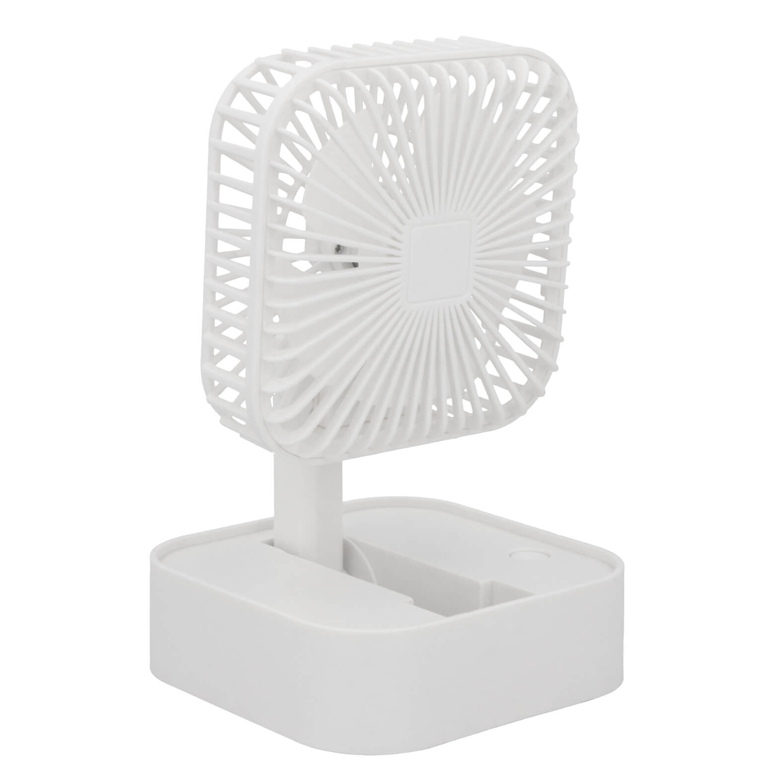 Mini ventilador plegable y de tamaño ajustable capaz de cambiar su posición a 180°. Incluye 3 velocidades, batería recargable y cable de carga DC5V.