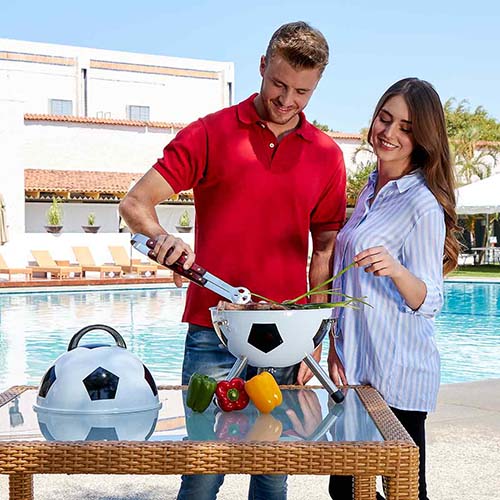 Asador portátil de carbón. Incluye parrilla y tapa con difusor de temperatura.