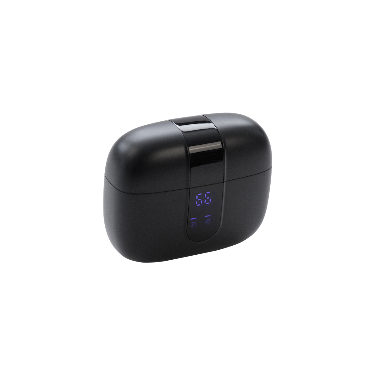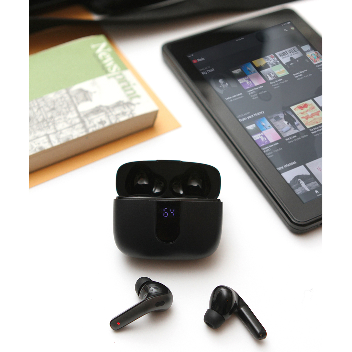 Audífonos bluetooth a prueba de agua y función touch, fabricados en plástico ABS, con display en la parte frontal que muestra el nivel de batería. Incluye cable de carga USB y caja de cartón individual.