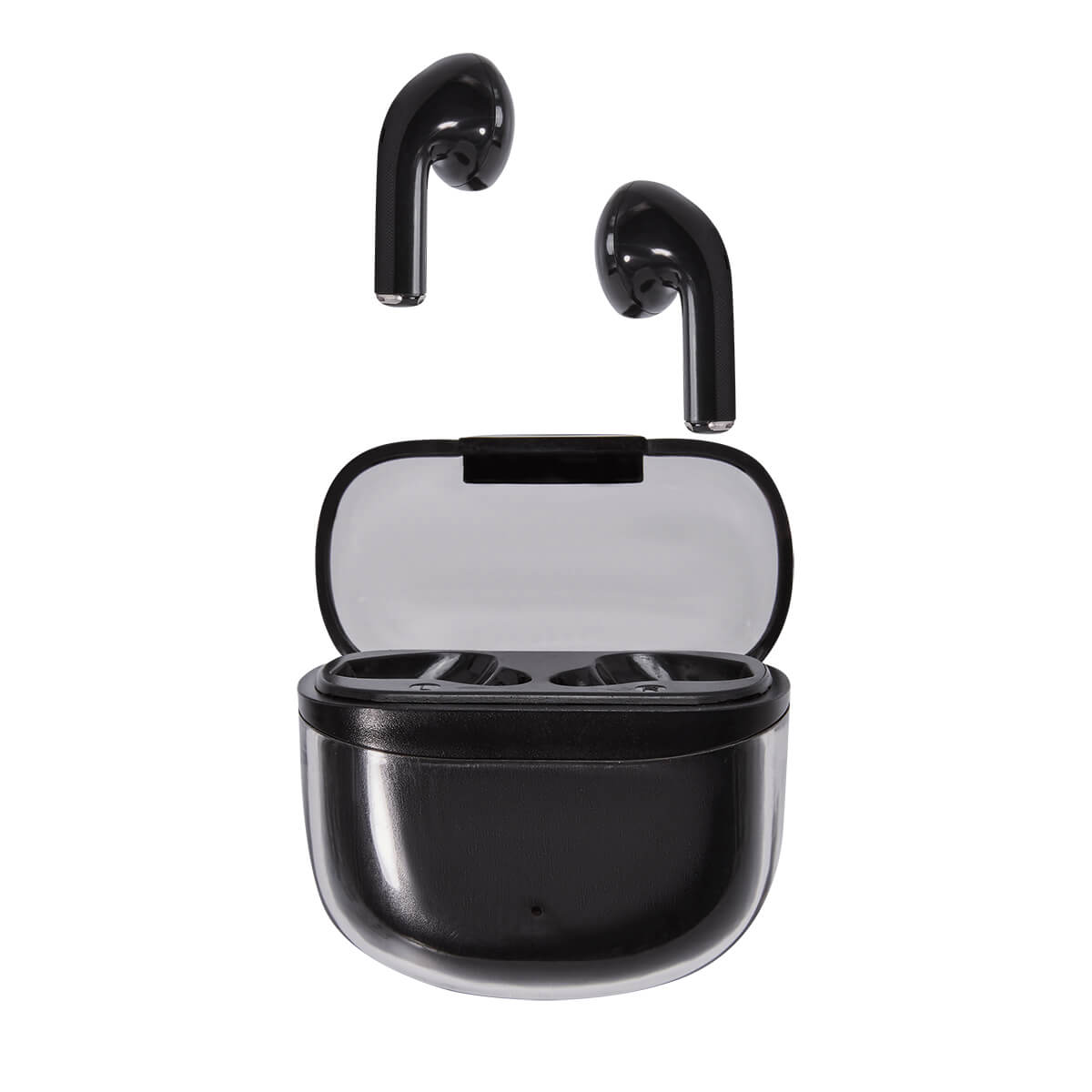 Audífonos bluetooth con base recargable. Controles integrados touch para llamadas, volumen y reproducción de audio. Reproducción de música 2 a 3 hrs aproximadamente. Rango de conexión de 10 metros. Incluye estuche de carga y cable cargador USB.