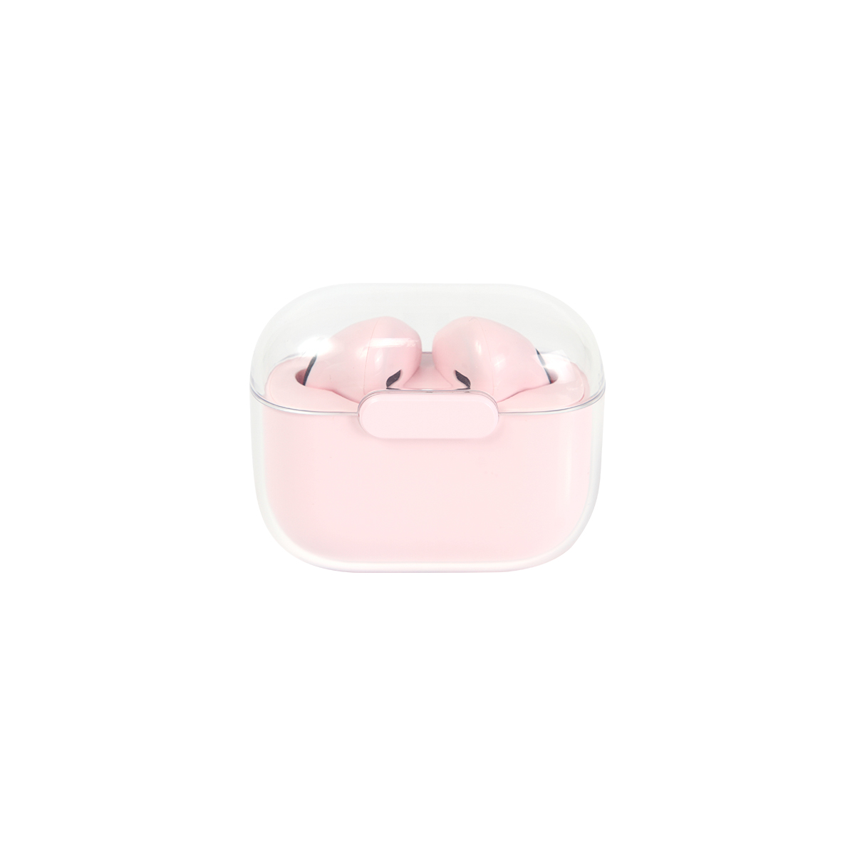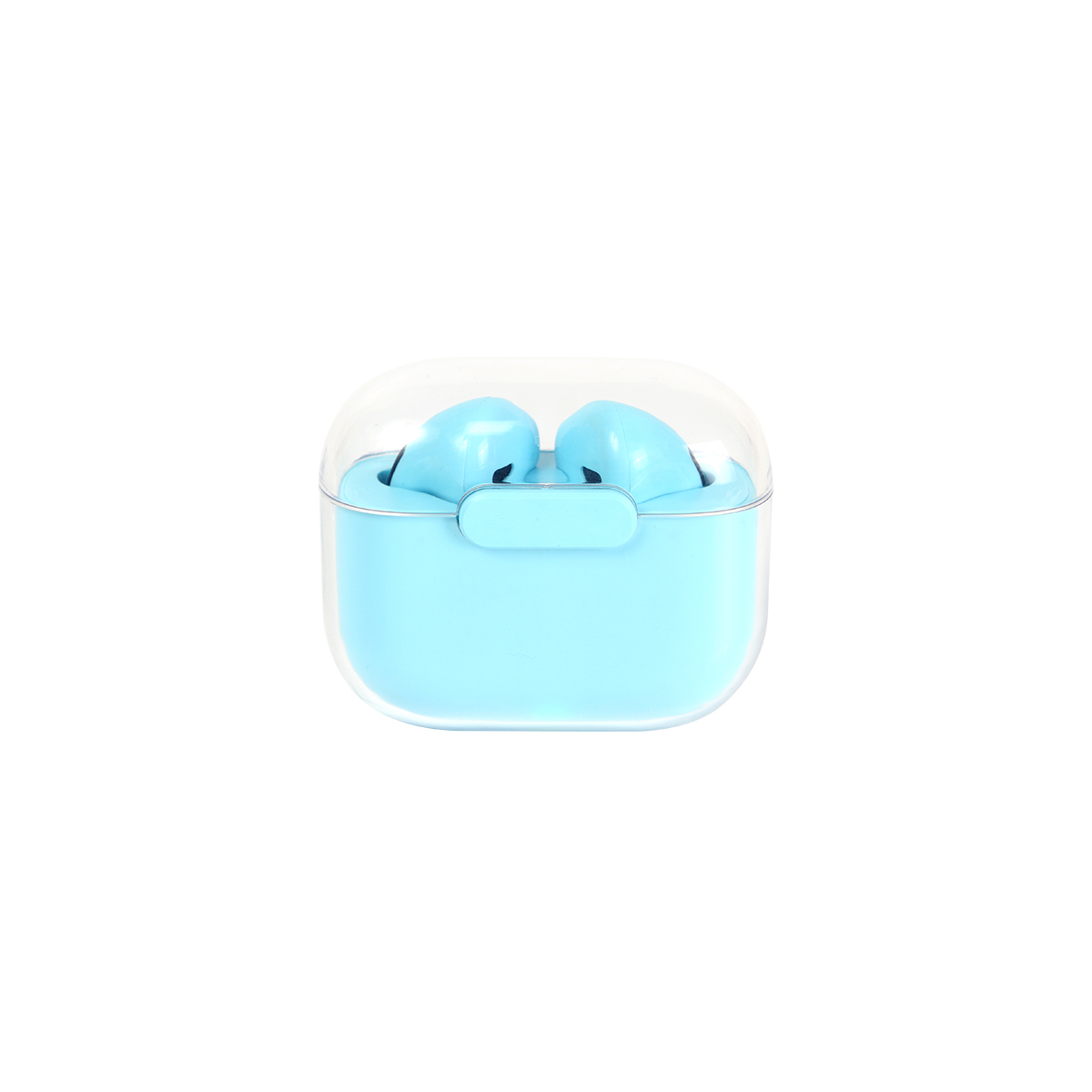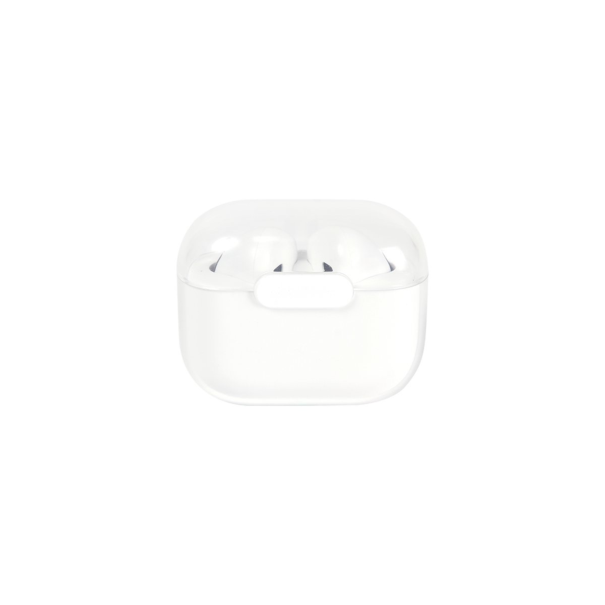 Set de audífonos inalámbricos, con estuche de carga. Distancia de transmisión de 10 m. Tiempo de reproducción de 4 a 5 horas. Puerto de carga tipo-C. Capacidad de batería de estuche de 250 mAh y de los audífonos de 30 mAh.