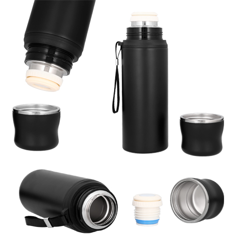 Termo con doble pared de acero inoxidable insulado al vacío. Incluye tapa de rosca que se utiliza como taza y una cinta ajustable para sujetarlo.