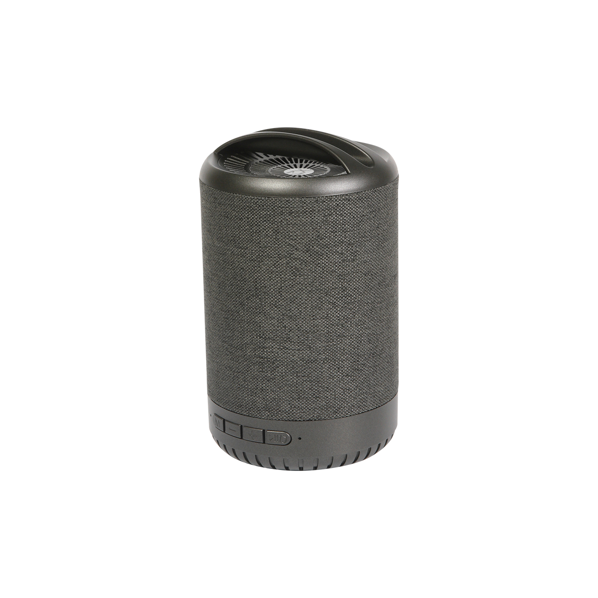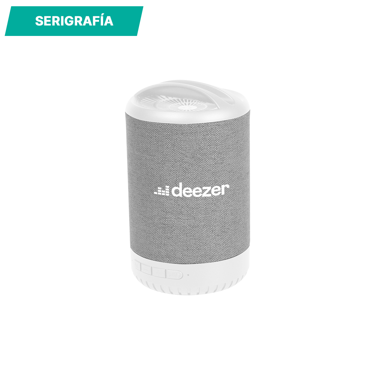Bocina bluetooth con radio FM, entrada para tarjeta TF y memoria USB, fabricada en plástico ABS con cubierta de tela y soporte para celular en la parte superior. En la parte inferior se encuentran 4 botones para manipular la musica, carga a través de cable USB (incluido). Incluye caja de cartón individual.