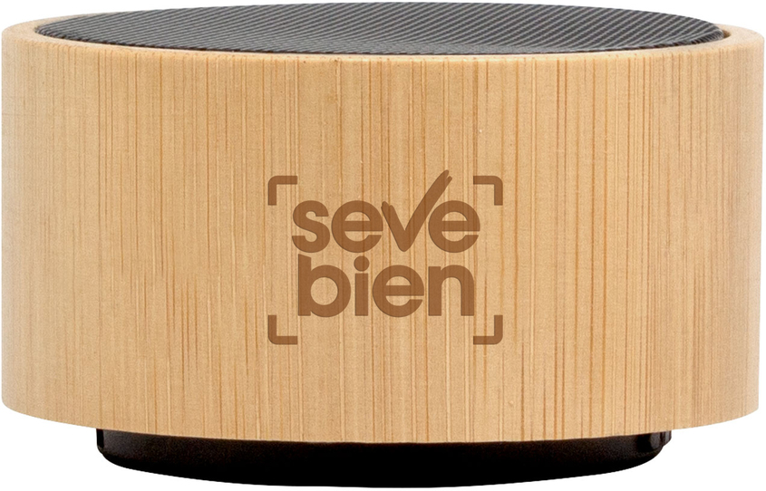 Ø7,5 x 4 cm. Bocina Bluetooth. Caja redonda de Bambú color natural con malla metálica en la parte superior. Base negra con panel de control. Permite recibir llamadas. Micrófono incorporado. Versión bluetooth: 5.0. Batería: 300 mAh. Potencia: 3W. Cable de carga y conexión USB tipo C en color negro. Presentación en caja de regalo Kraft.