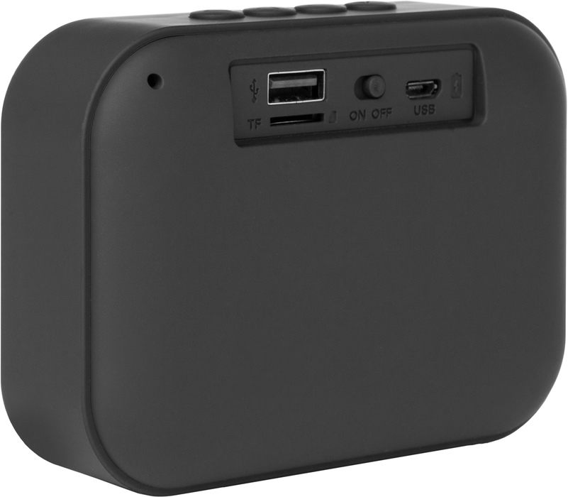 11 x 8 x 4 cm. Plástico engomado y tela. Bocina bluetooth / USB. En la parte superior, botones de modo, volumen y play. Con el botón Modo se elige entre las opciones de Bluetooth y USB. Opción de responder llamadas desde el parlante pulsando una vez el botón Play cuando entra la llamada. Base con detalles antideslizantes. Base antideslizante.Incluye cable USB para carga. Presentación en caja de regalo.