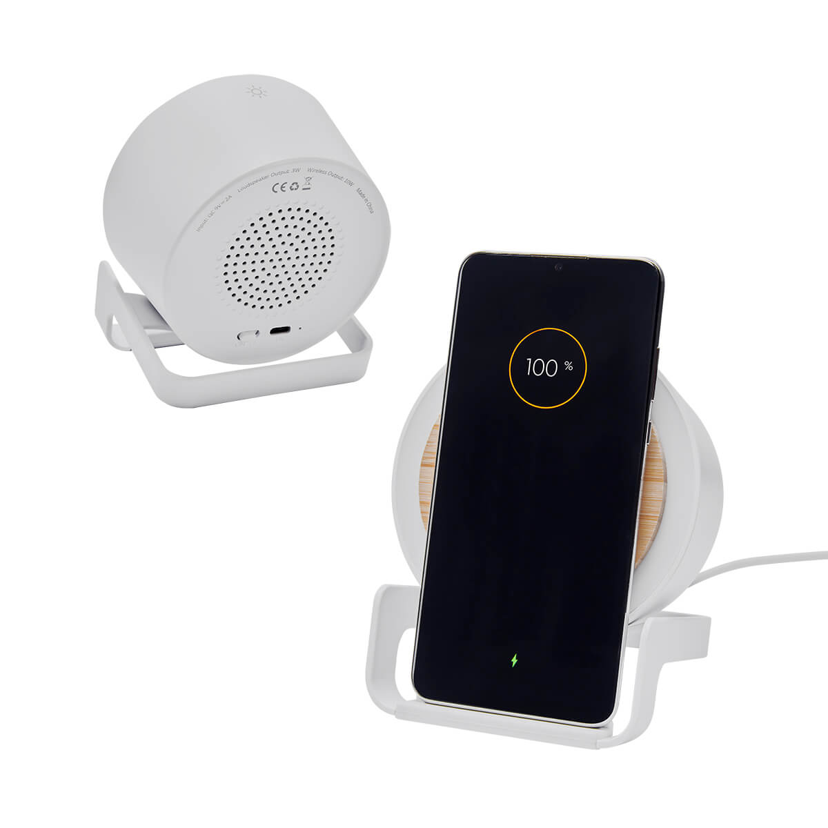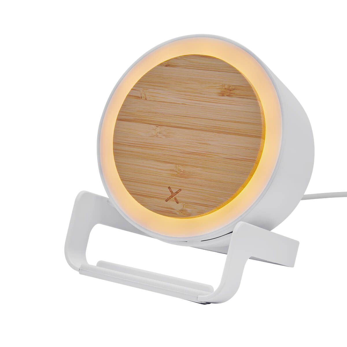 Bocina bluetooth con cargador inalámbrico de 5W y luz LED ajustable a 3 diferentes intensidades. Soporte vertical para teléfono celular. Incluye cable cargador USB.