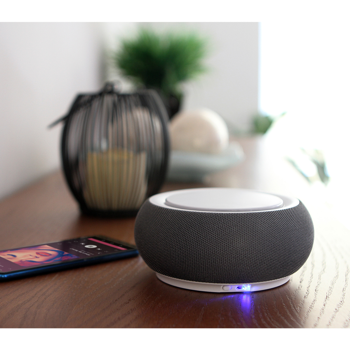 Bocina inalámbrica con función bluetooth, cargador inalámbrico y luz led; carga a través de cable usb (incluido). Incluye caja individual de cartón.