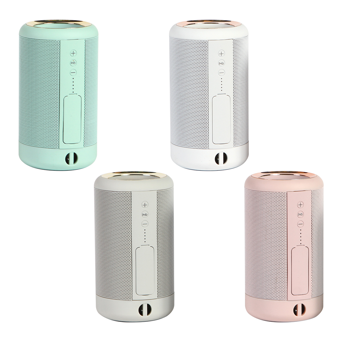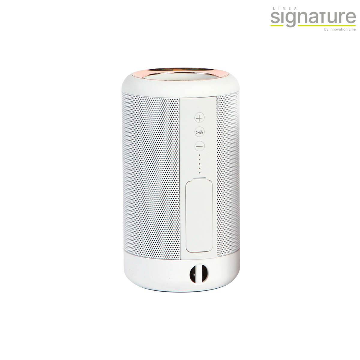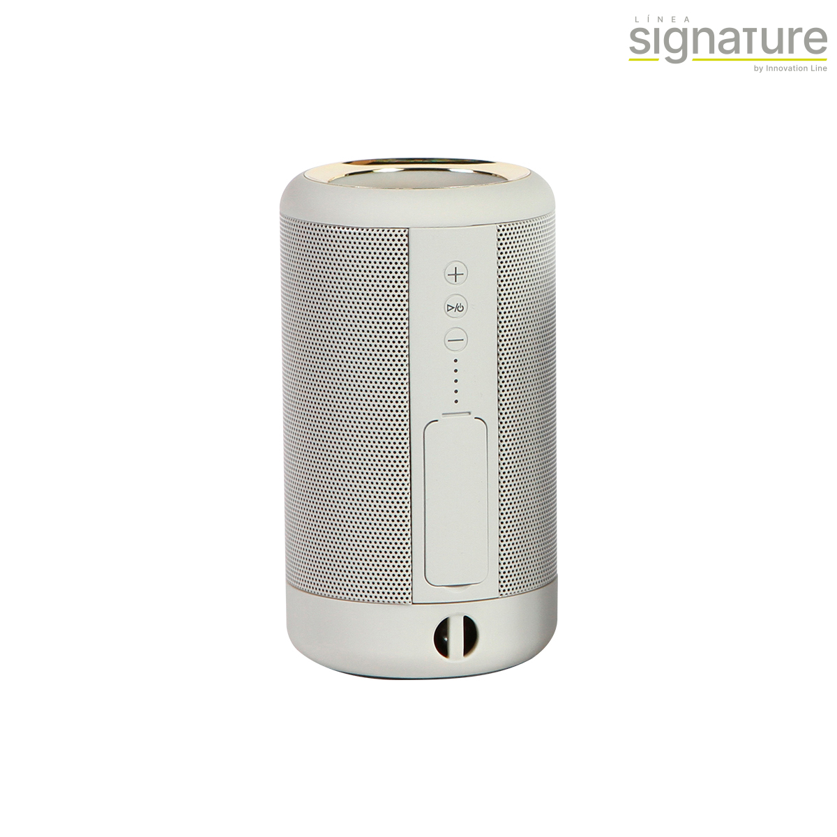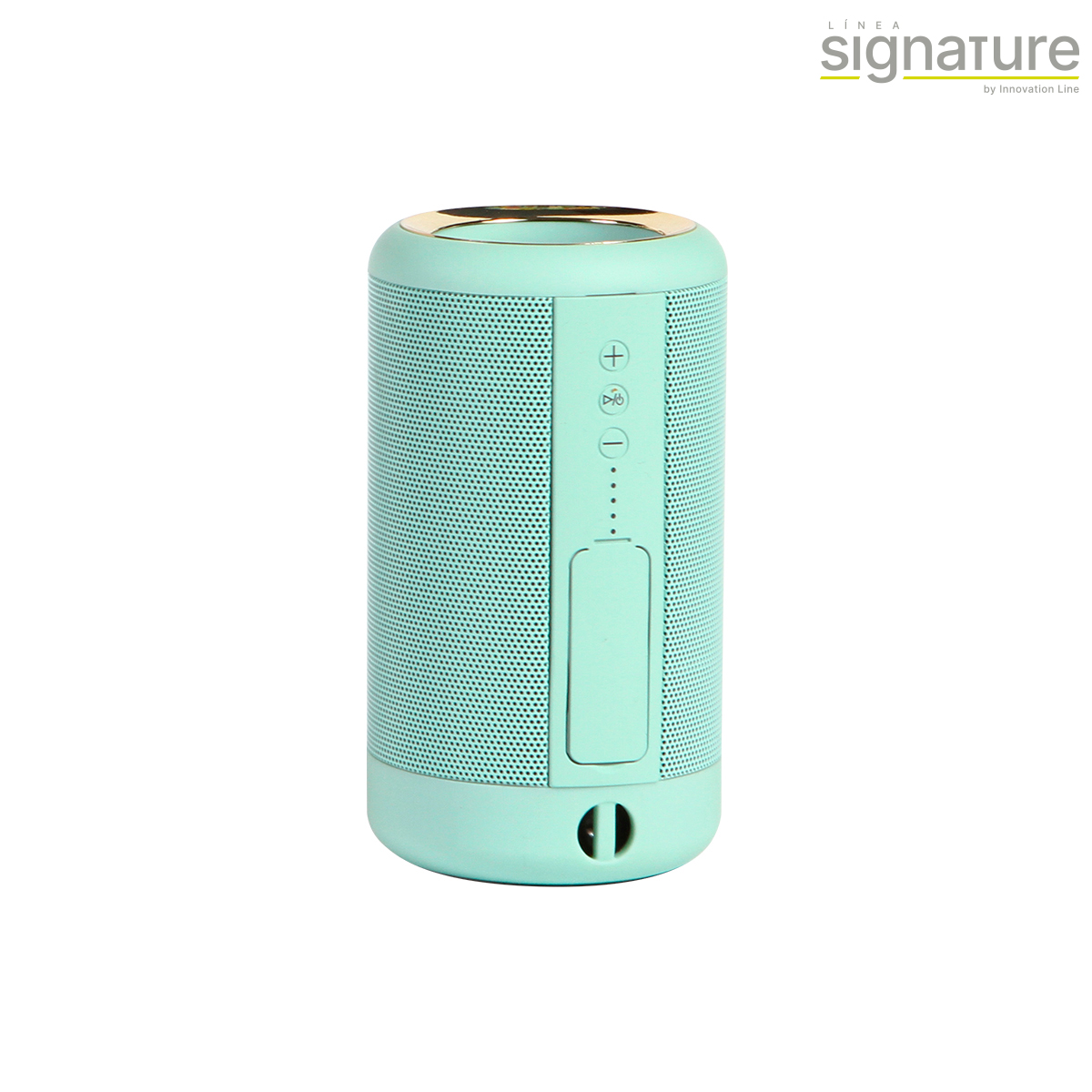 Bocina bluetooth, power bank con capacidad de 1,200 mAh, batería integrada de iones de litio, fabricada en plástico ABS con acabado rubber (suave), con un detalle color dorado en la parte superior, con entrada protegida.