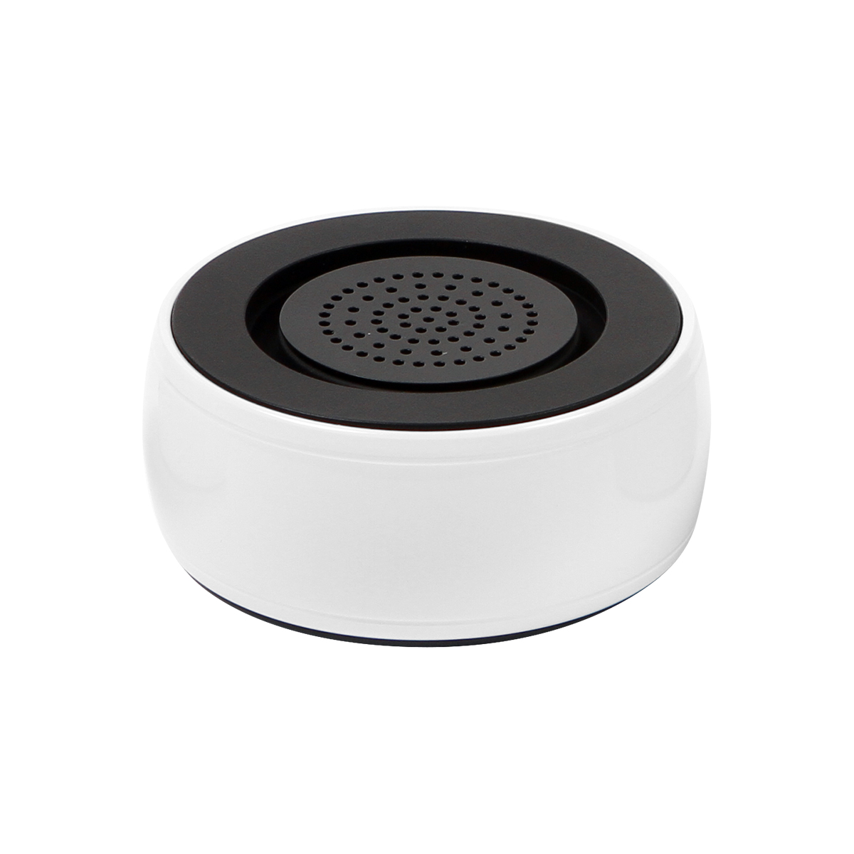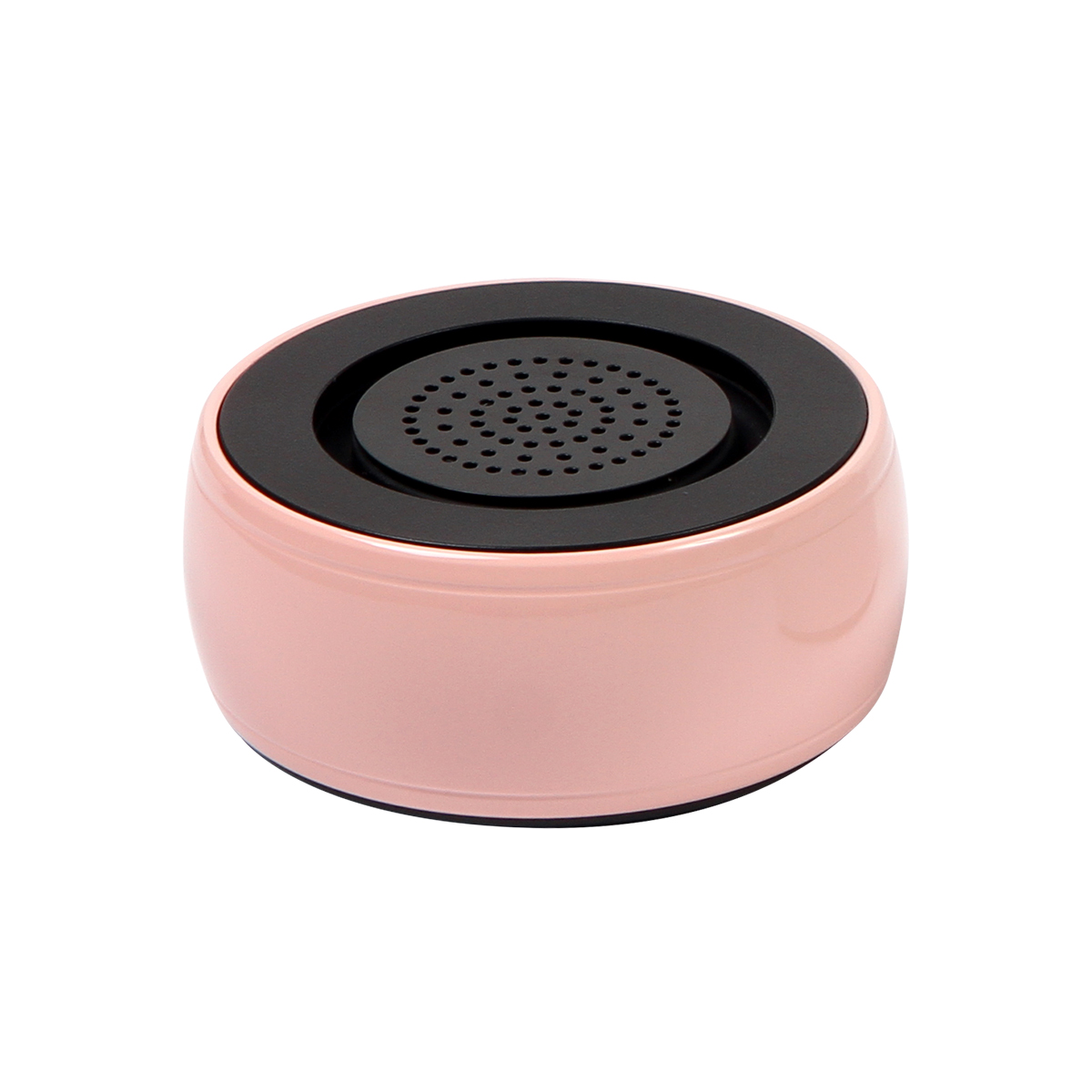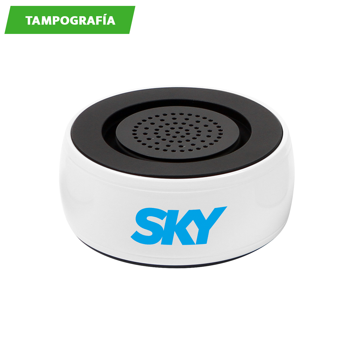 Bocina portátil circular bluetooth fabricada en metal y plástico, de tamaño compacto lo que la hace fácil de transportar, con radio FM, entrada auxiliar para audio y tarjeta TF.