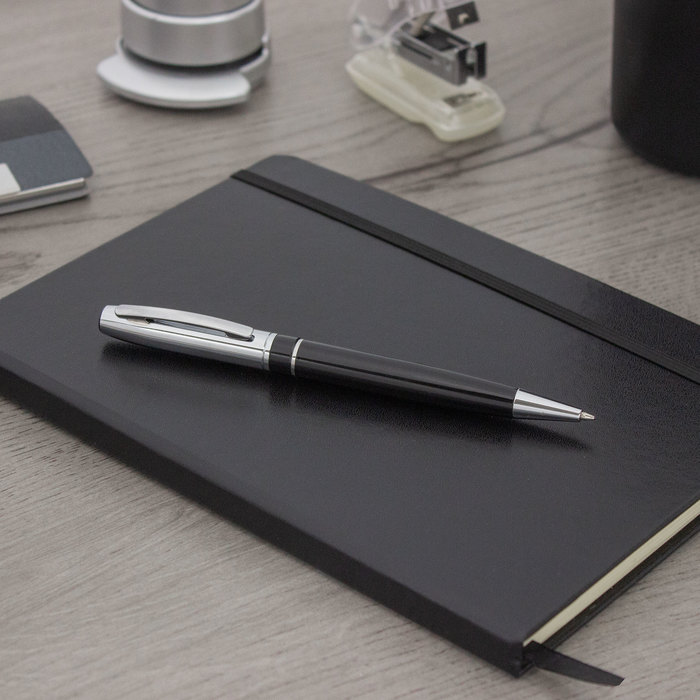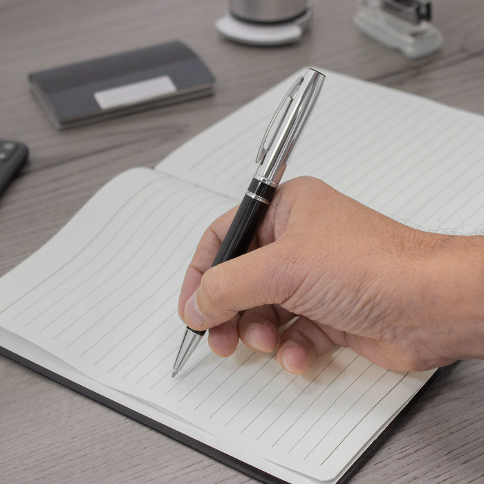 Metálico. Cuerpo color negro. Tambor superior, clip, anillo y puntera color plata. Apertura giratoria. Destape plata en la parte superior e inferior. Tinta azul. Presentación en caja de regalo.