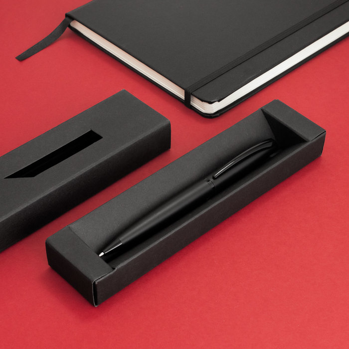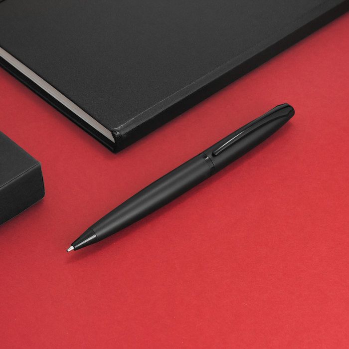 Metálico. Cuerpo de aluminio con acabado mate. Clip, anillo central y puntera de hierro con acabado brillante. Cartucho metálico de origen alemán. Tambor superior con revestimiento galvánico. Apertura giratoria. Tinta negra. Presentación en caja de regalo.
