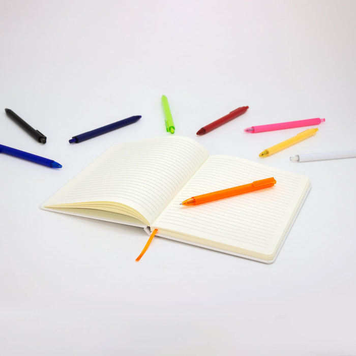 Plástico ABS. Bolígrafo retráctil. Cuerpo de diferentes colores acabado mate. Pulsador, clip y puntera translucidos del mismo color del cuerpo. Tinta negra.