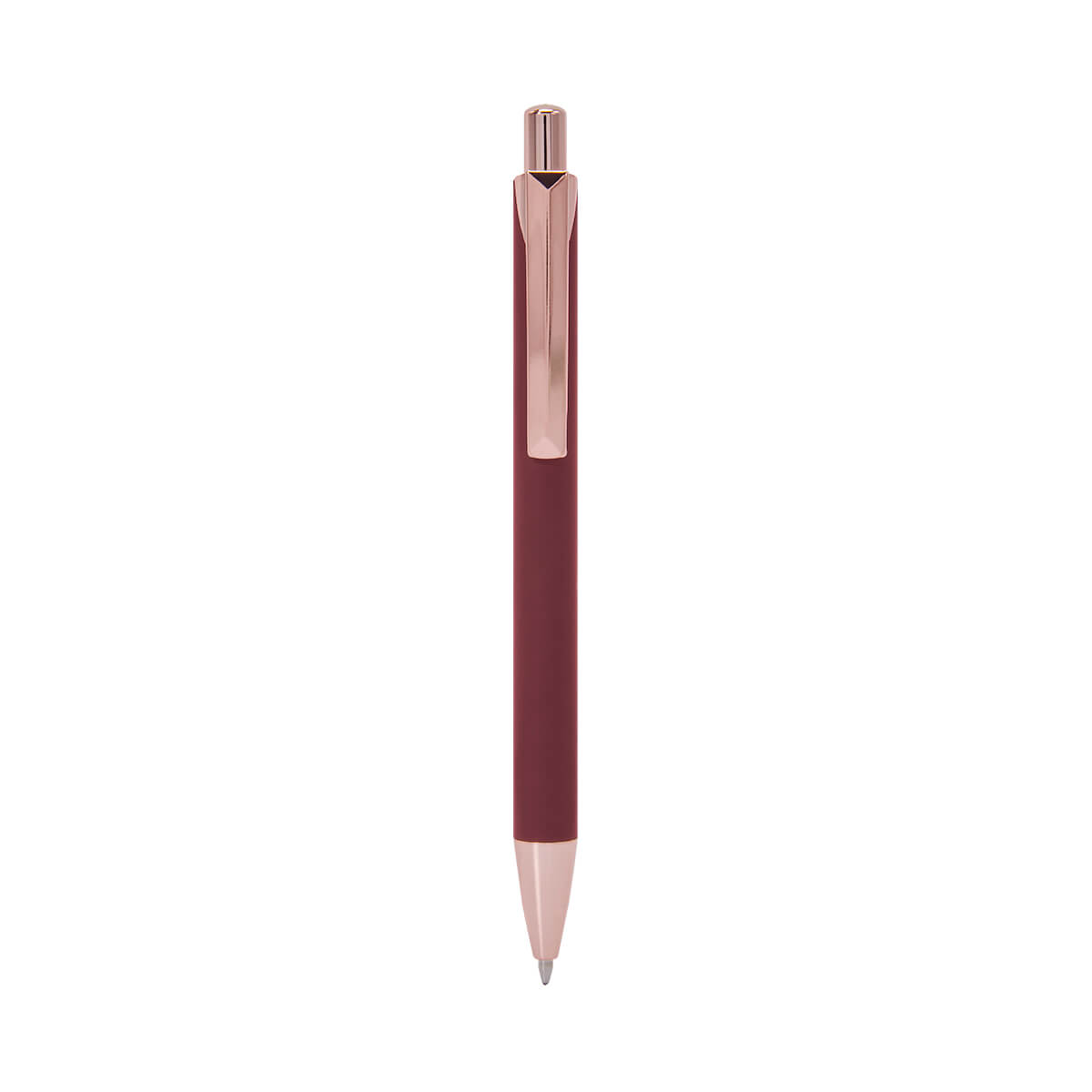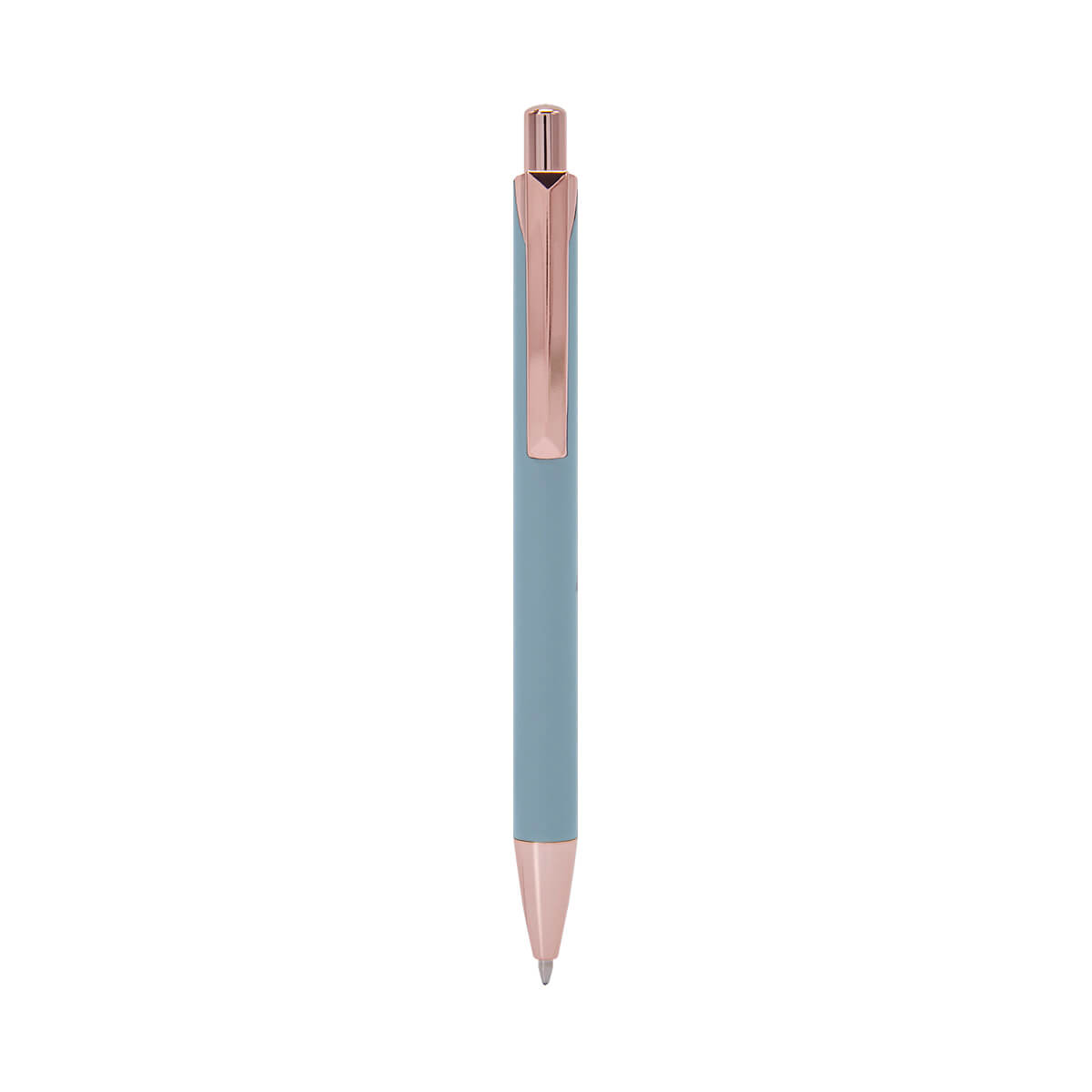 Bolígrafo metálico con terminado tipo rubber. Botón, clip y punta en rose gold. Mecanismo pulsador. Incluye funda.