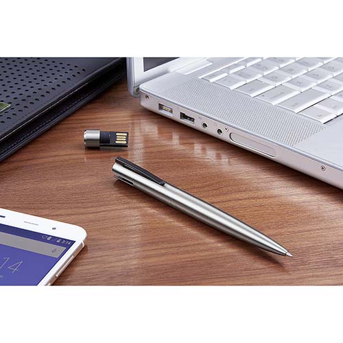 Bolígrafo USB de 8 GB. Memoria USB con función OTG para transferencia de información entre dispositivos. Compatibilidad USB/Micro USB. Mecanismo twist. Incluye estuche.