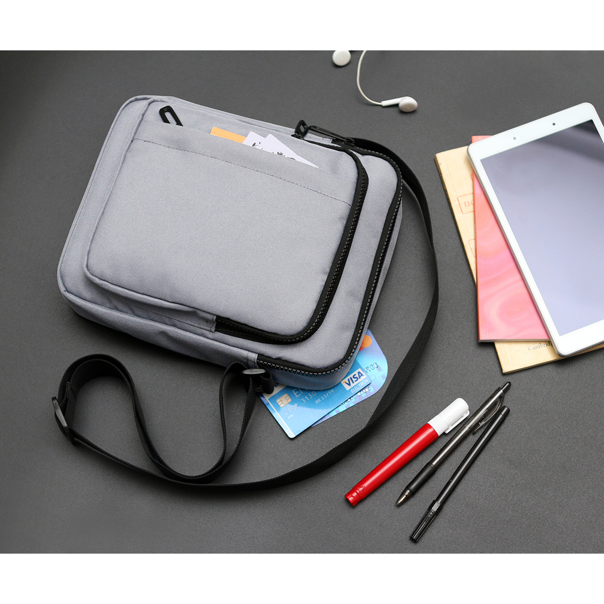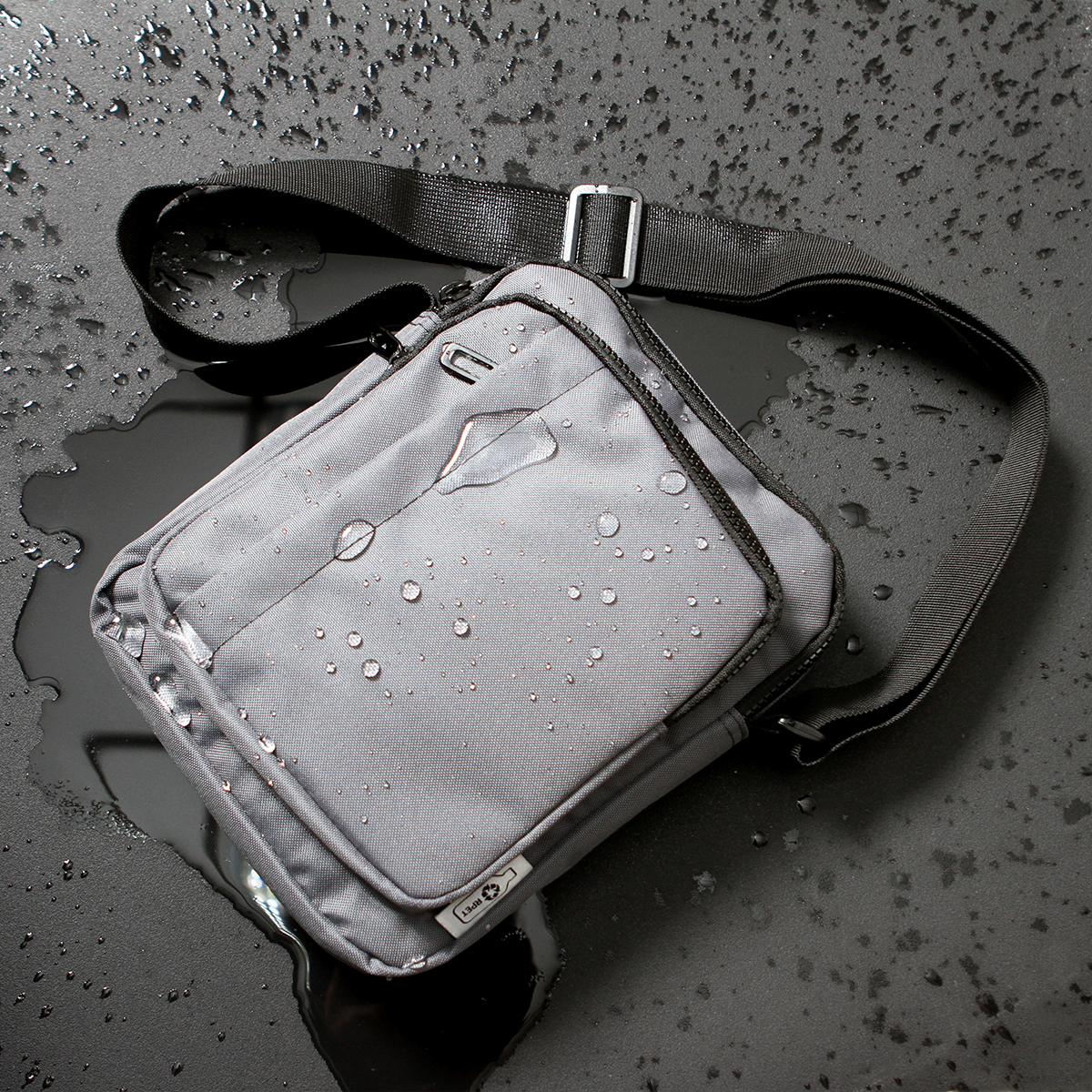 Bolsa multiusos fabricada en poliéster reciclado (RPET) a prueba de agua. Es una opción versátil y ecoamigable para llevar tus pertenencias de manera segura y protegida en diversas situaciones. La bolsa cuenta con dos compartimentos principales espaciosos y un bolsillo frontal con cierre que te permite organizar y guardar objetos más pequeños de forma segura y accesible. También incluye una correa ajustable que te permite llevarla cómodamente al hombro o cruzada en el cuerpo. El RPET es un material resistente y duradero que puede soportar el uso diario y el desgaste, lo que lo hace ideal para productos textiles. Además es sostenible porque utilizan materiales reciclados en su fabricación, lo que reduce la cantidad de residuos y disminuye el impacto ambiental.