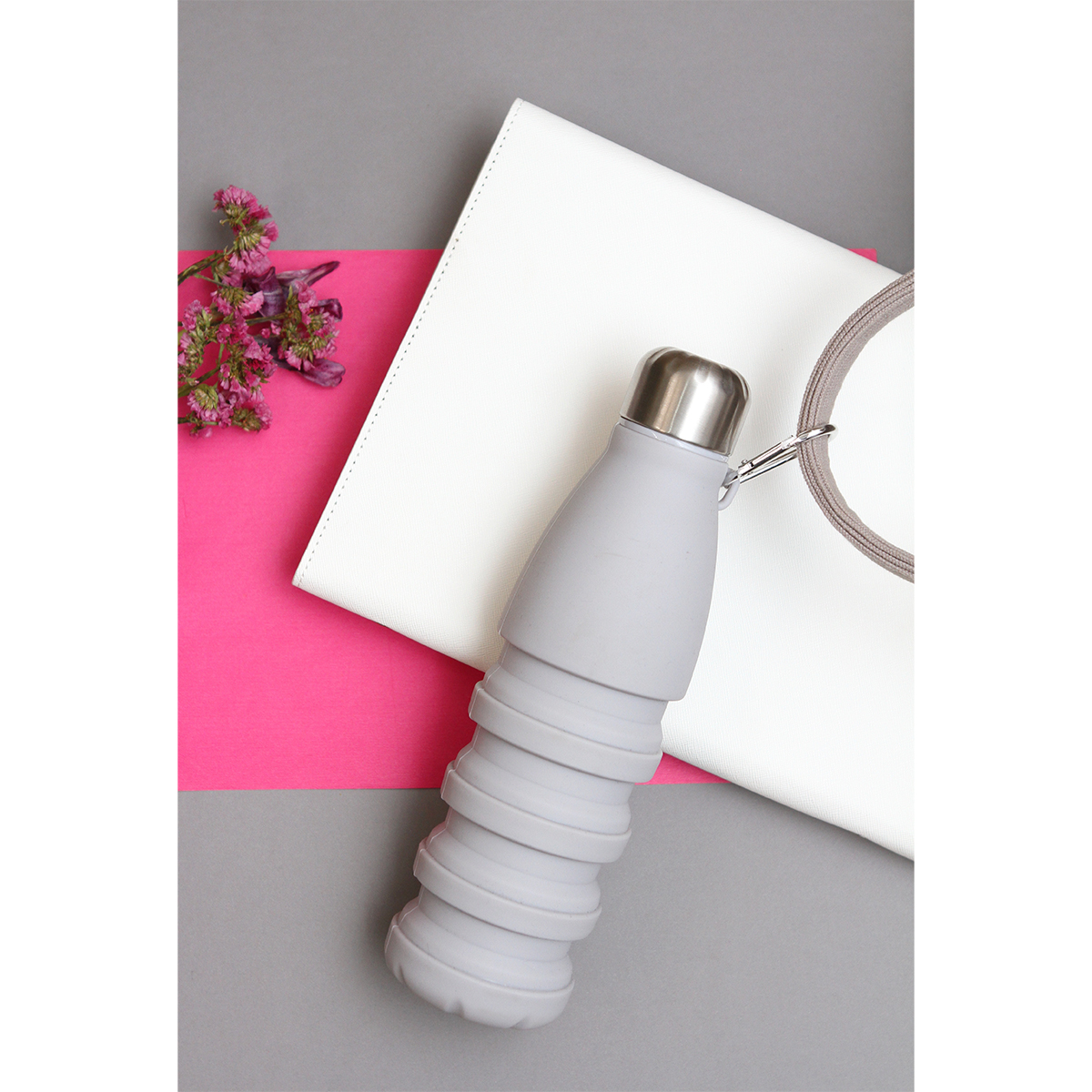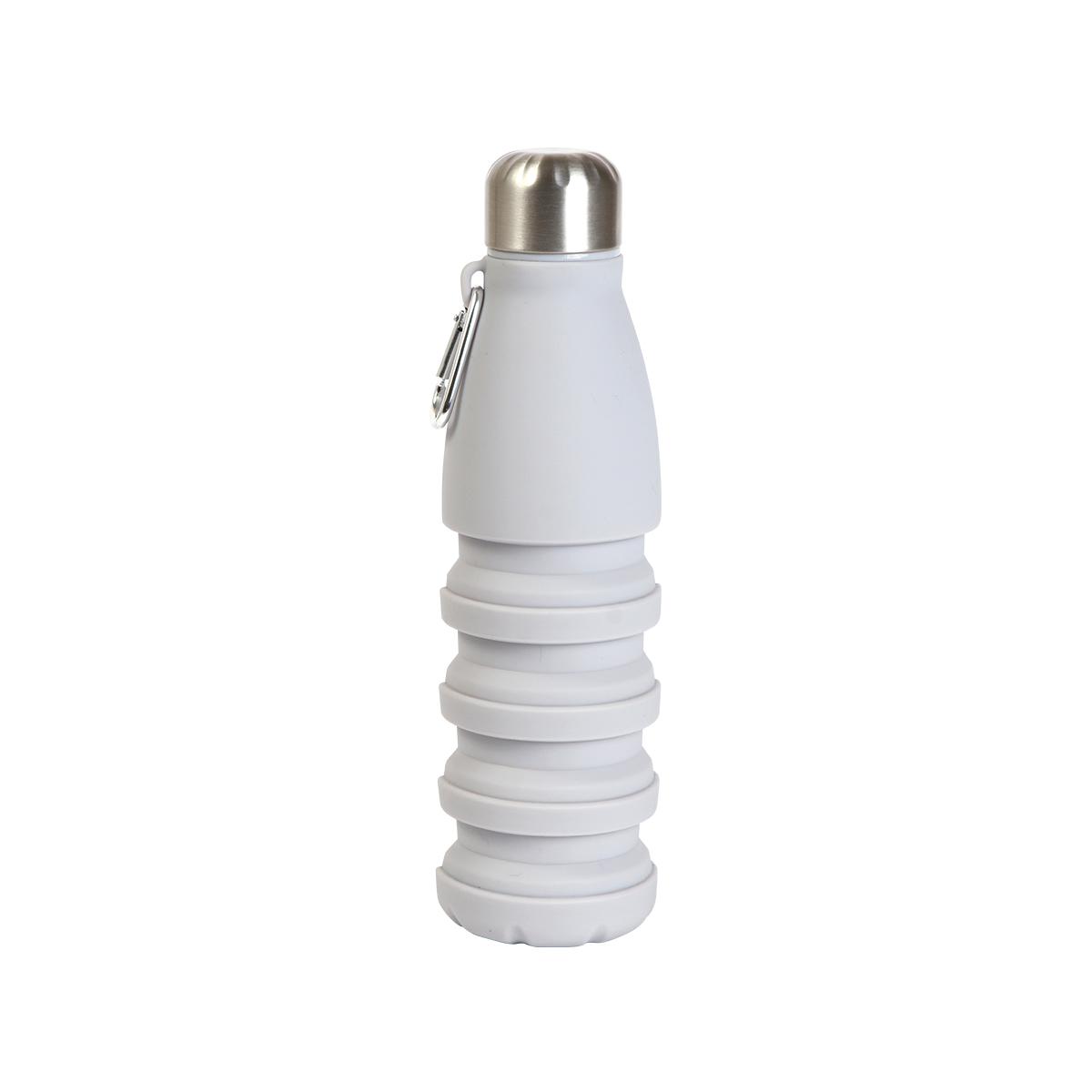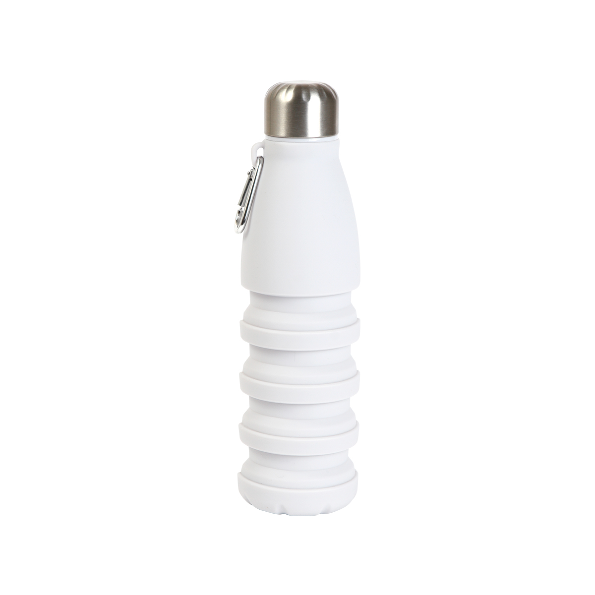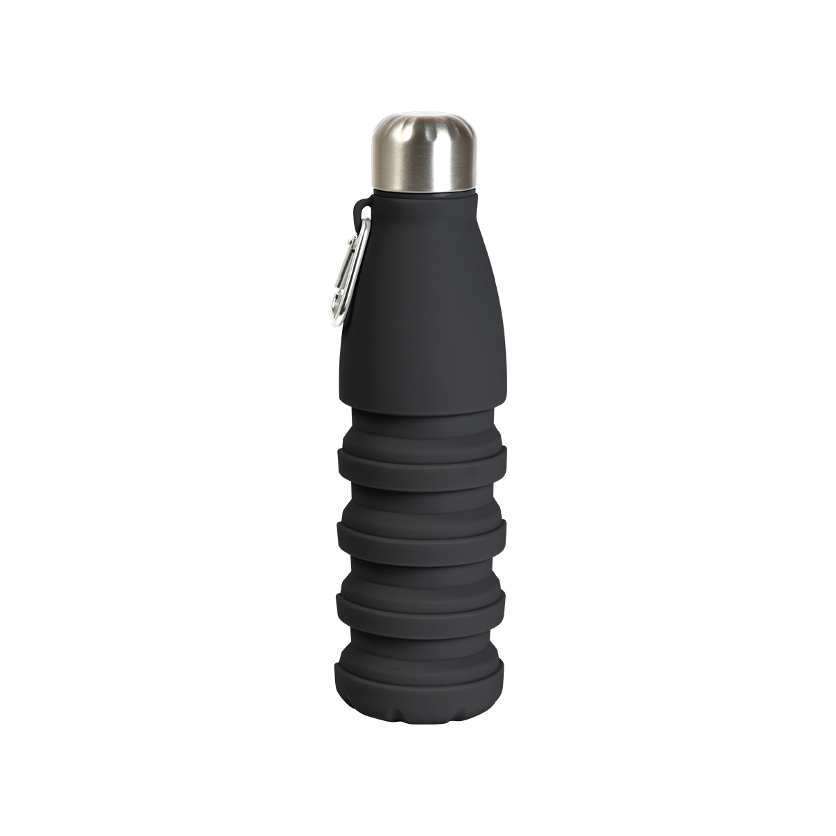 Botella retráctil fabricada en silicón, con capacidad de 550 ml, diseño en color sólido, tapa y arnés fabricados en acero inoxidable. Incluye mosquetón.