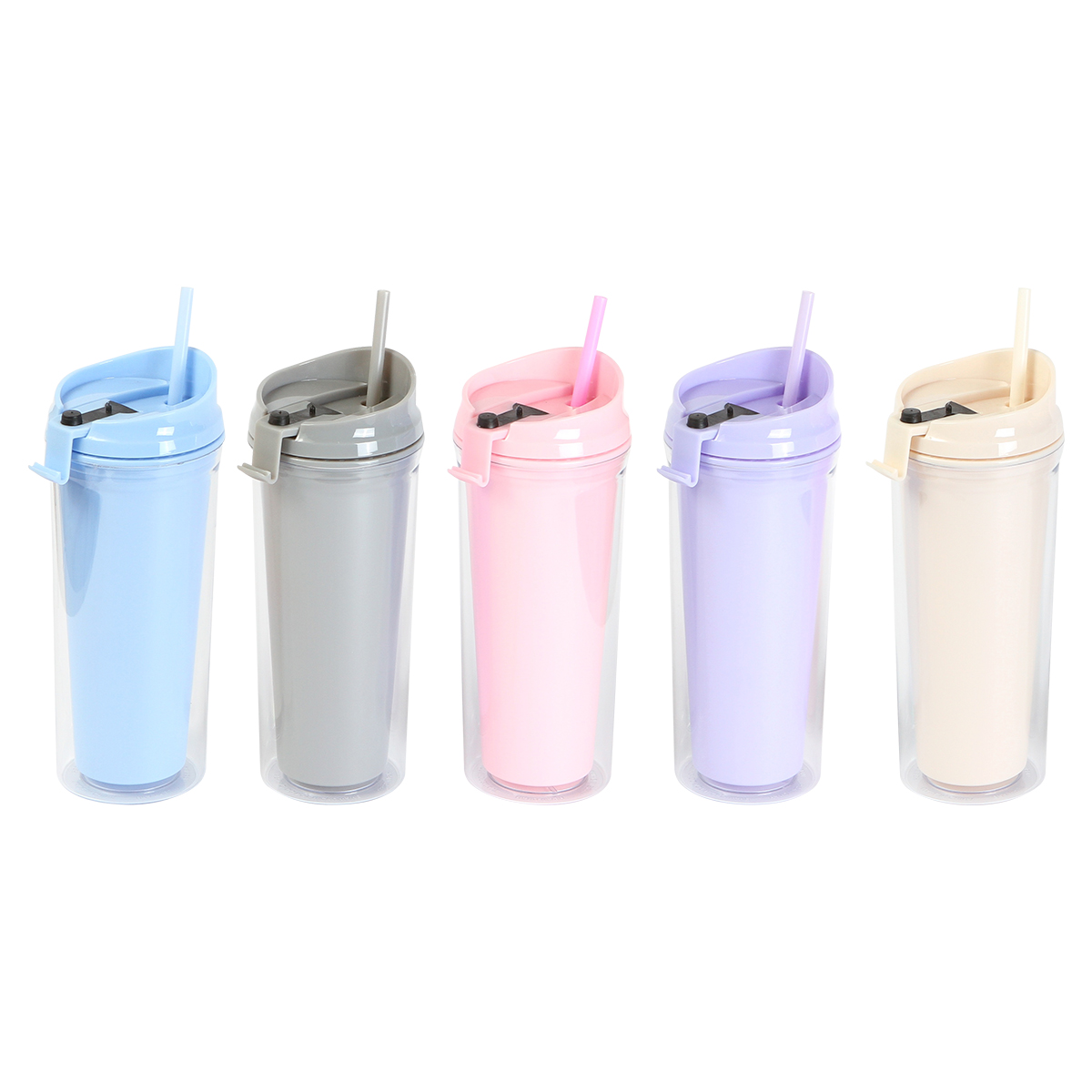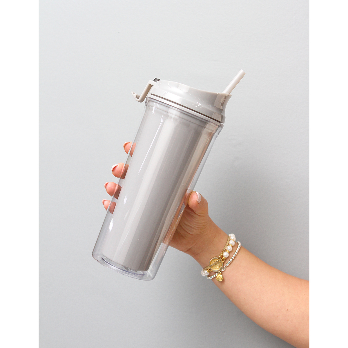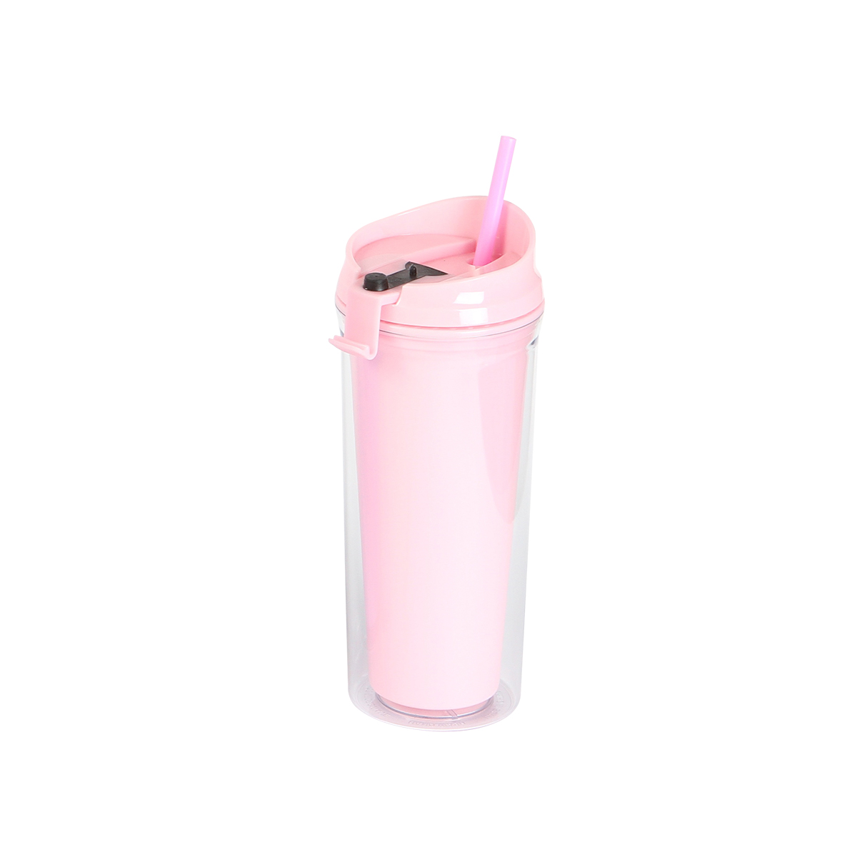 Botella doble pared; pared interna de color y externa transparente, fabricado en acrilonitrilo estireno (AS). Incluye popote fabricado en poliestireno (PS). El diseño de la tapa también ayuda a beber directo de la boquilla . Capacidad de 690 ml.