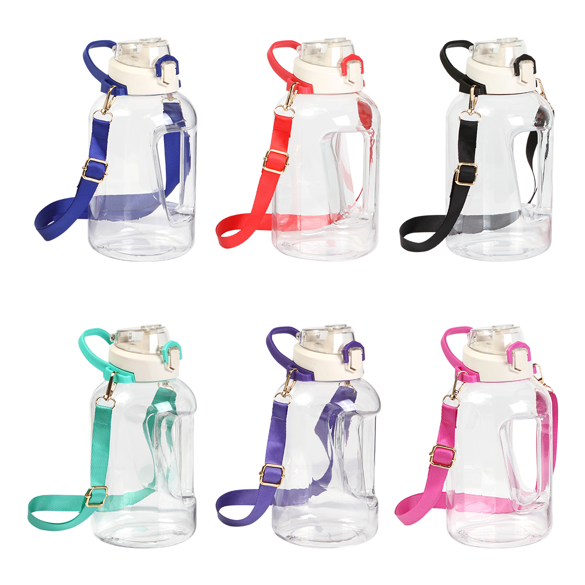 Botella jumbo de plástico transparente con capacidad de 1.4 litros (48 oz) , tapa con botón de seguridad, correa de color con arnés y agarradera, su tapa en rosca es ideal para mantener seguro el liquido de la botella, y su correa de color con arnés desmontable  se puede ajustar a tu gusto .
