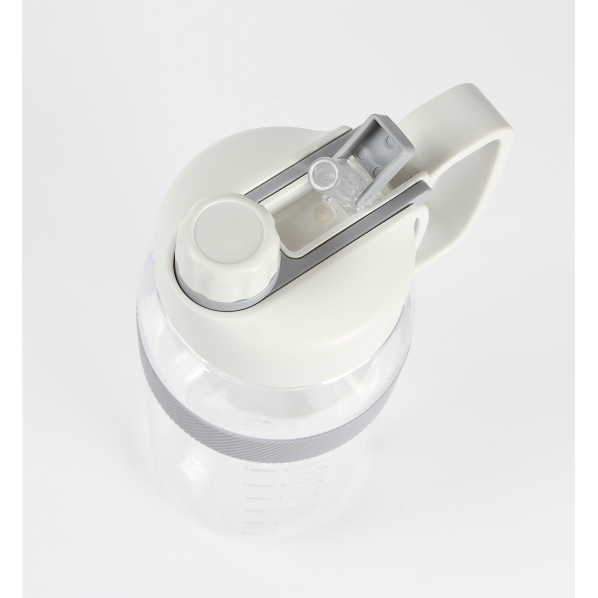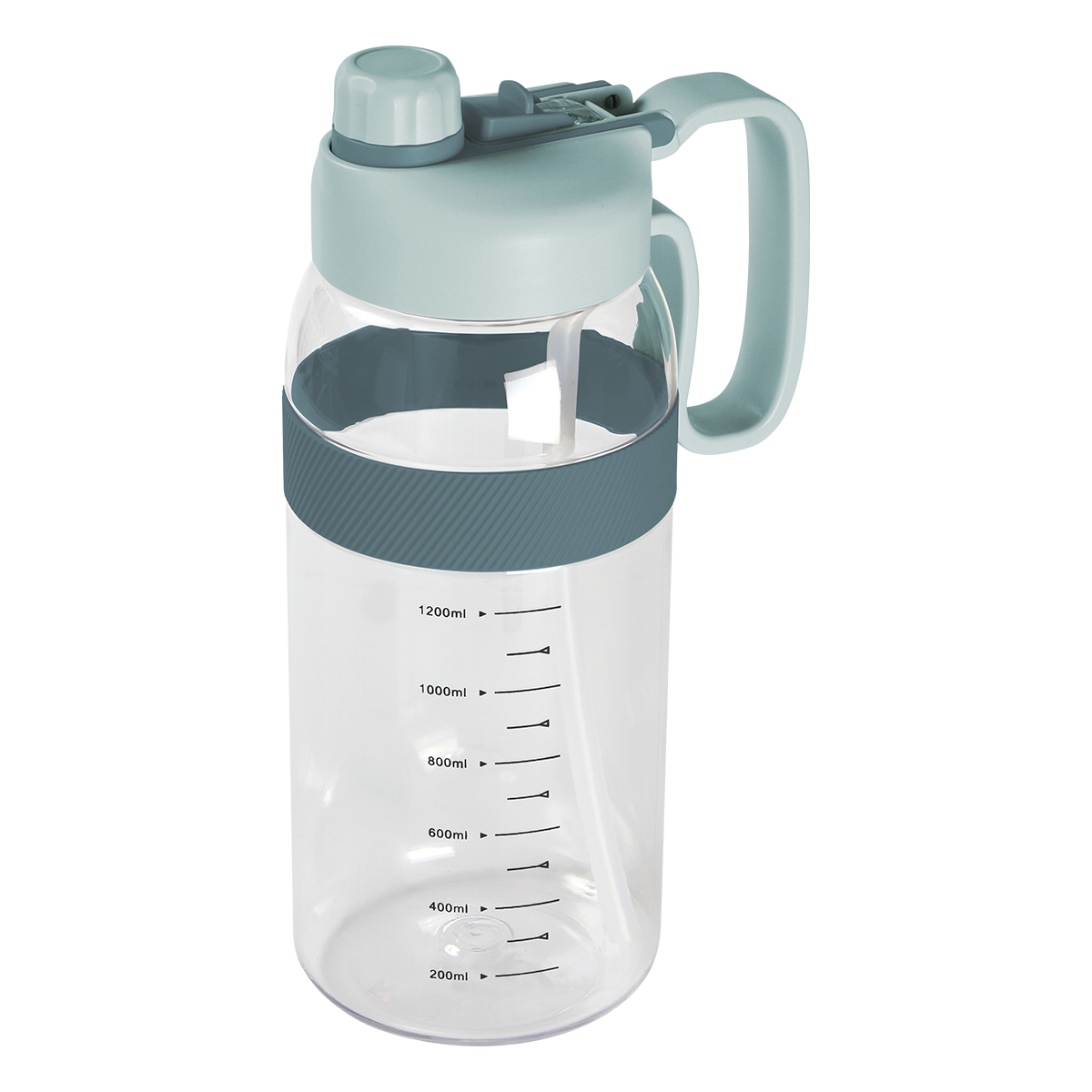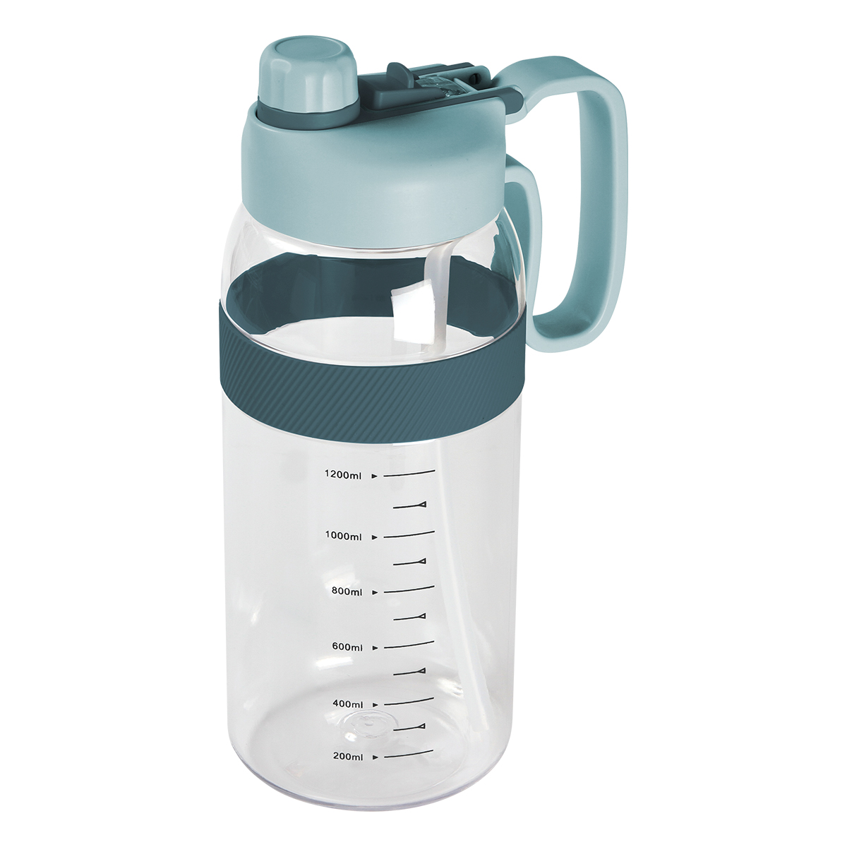 Botella deportiva fabricada en PETG (poliéster de glicol) con asa de plástico, popote integrado, tapa de rosca con boquilla, detalle de silicón y escala de medición . Fabricada en materiales de grado alimenticio, no usar en microondas. Capacidad de 2,000 ml (67.5 oz).