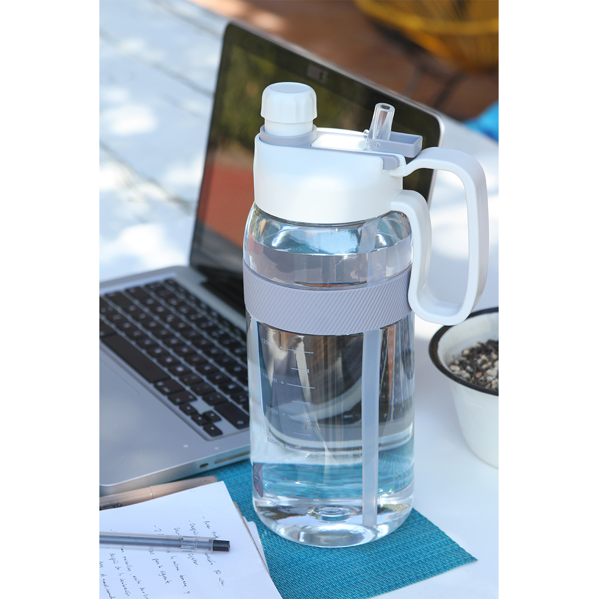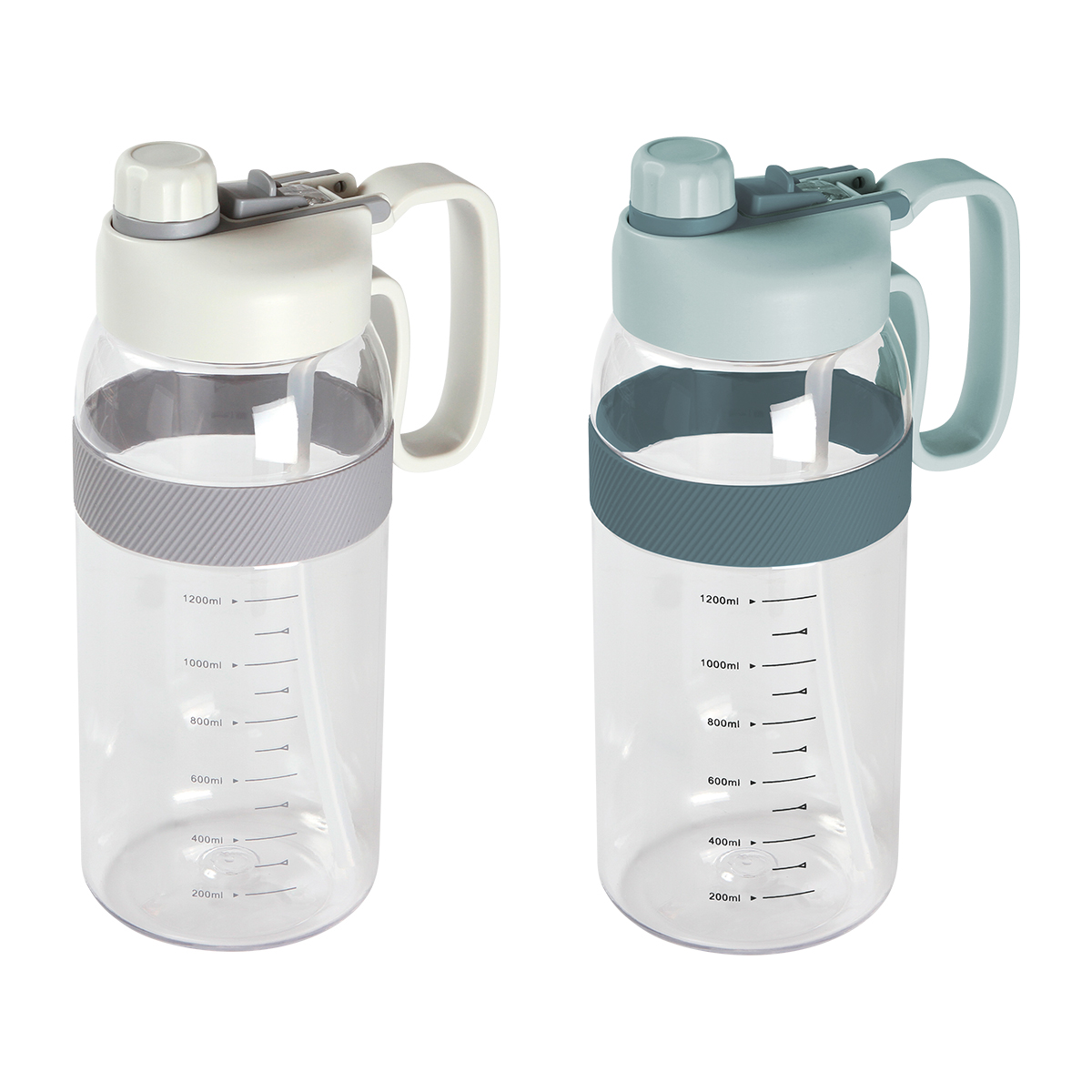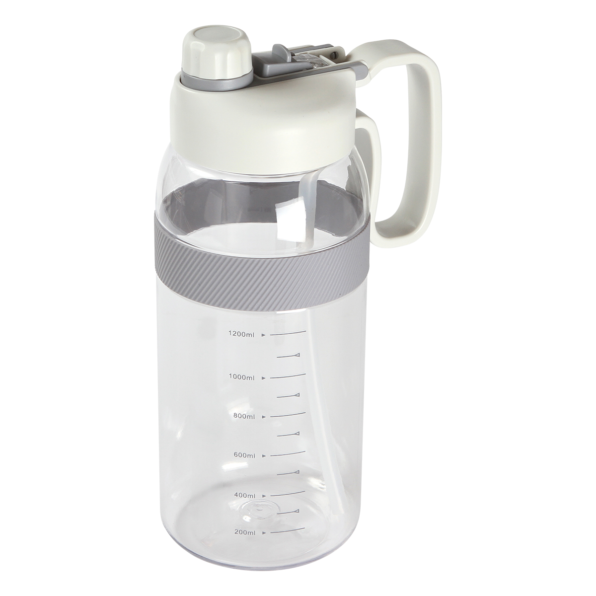 Botella deportiva fabricada en PETG (poliéster de glicol) con asa de plástico, popote integrado, tapa de rosca con boquilla, detalle de silicón y escala de medición . Fabricada en materiales de grado alimenticio, no usar en microondas. Capacidad de 2,000 ml (67.5 oz).