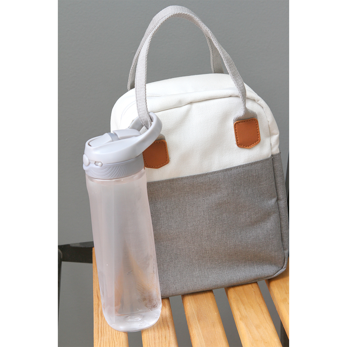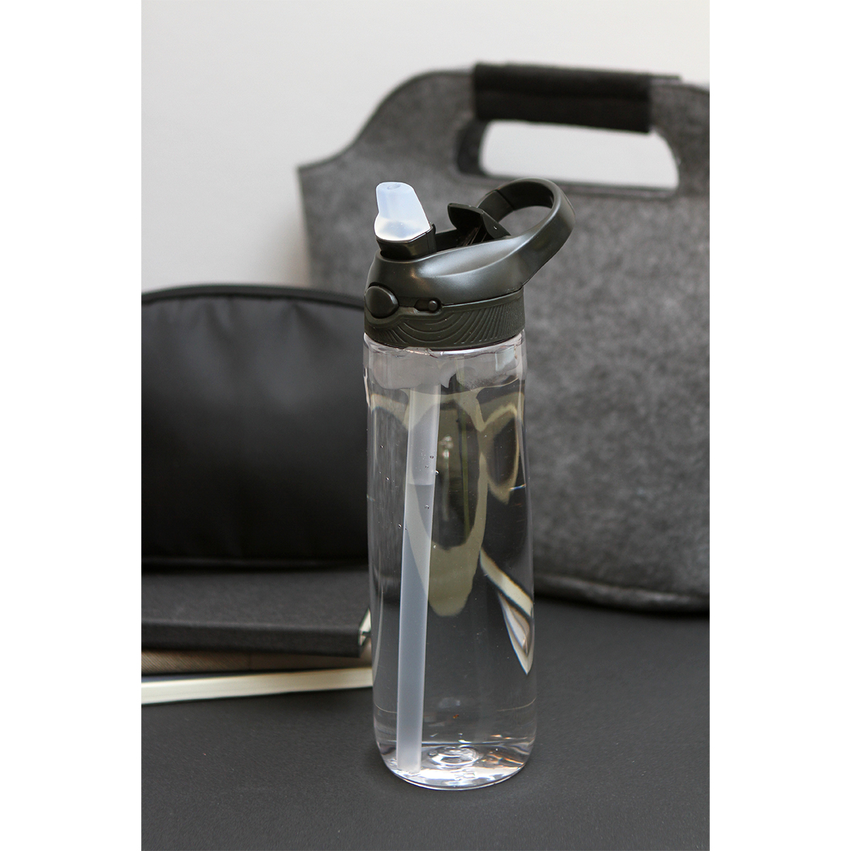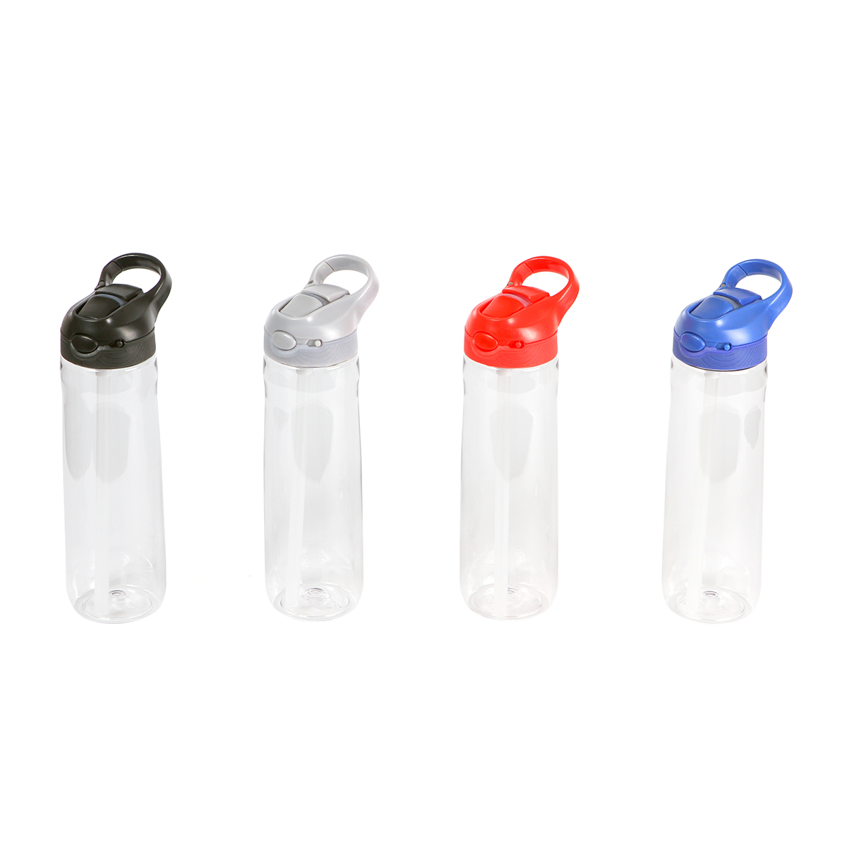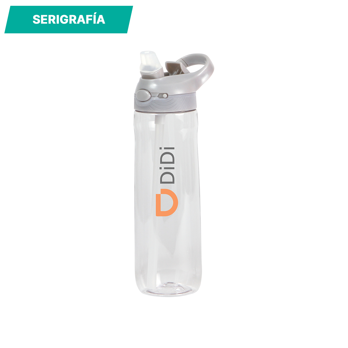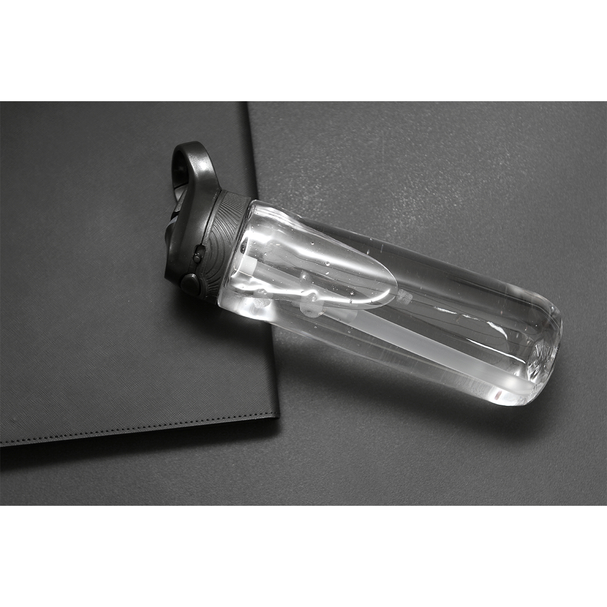 Botella con cuerpo transparente y tapa con bloqueo de seguridad, cuenta con boquilla de silicona y agarradera de color, fabricada en tritán y ABS. Capacidad de 750 ml, peso de 183 g.