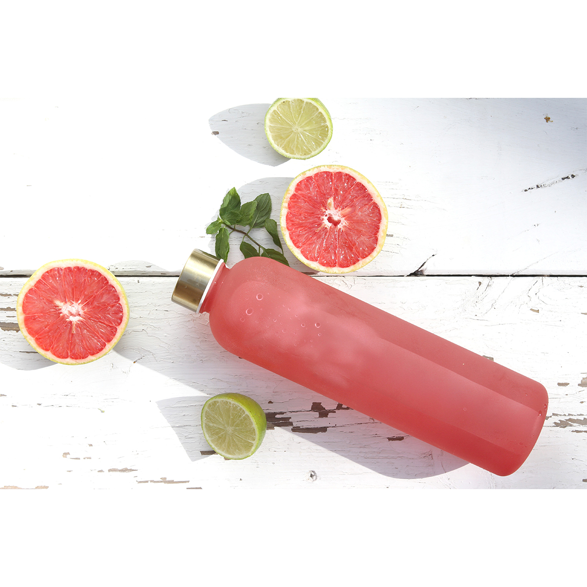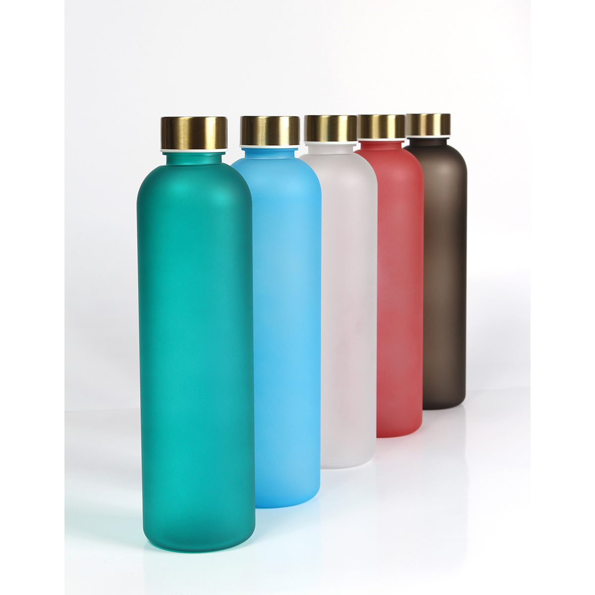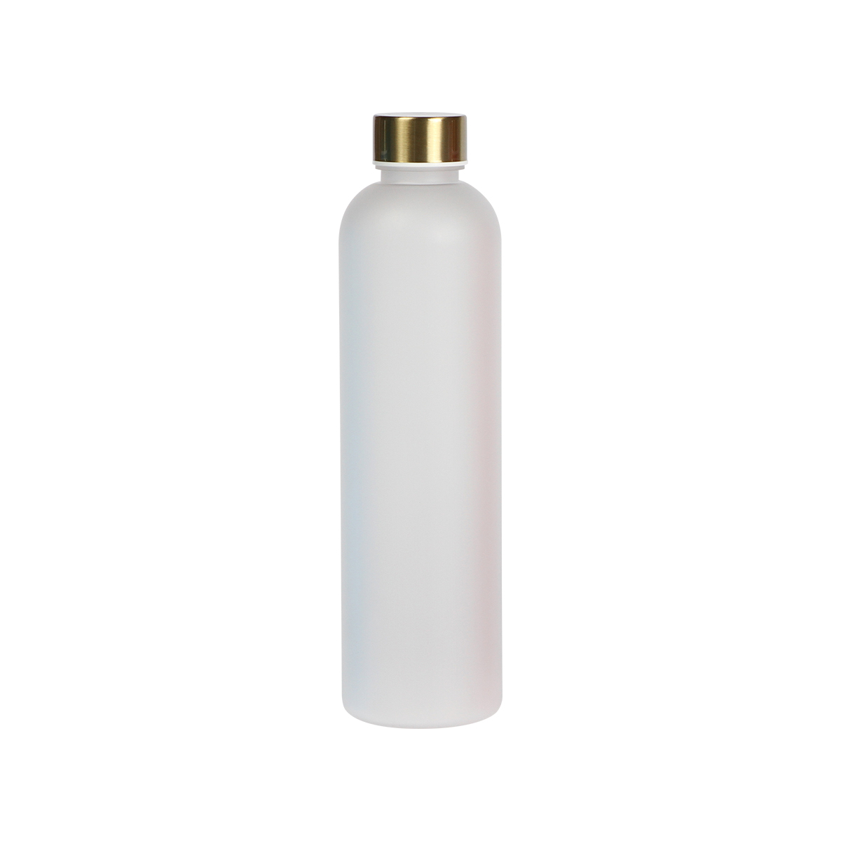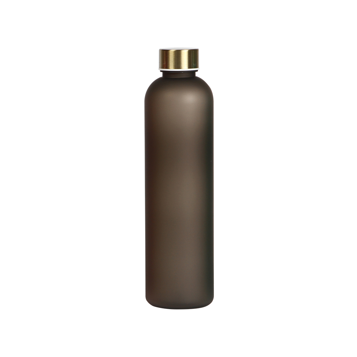 Botella de plástico mate fabricada con materiales de alta calidad libres de contaminante BPA, con tapa dorada, capacidad de 1 litro, terminado mate. Utilizando materiales exentos de contaminantes BPA, lo que garantiza la máxima seguridad para tu salud y el medio ambiente, incluye caja individual