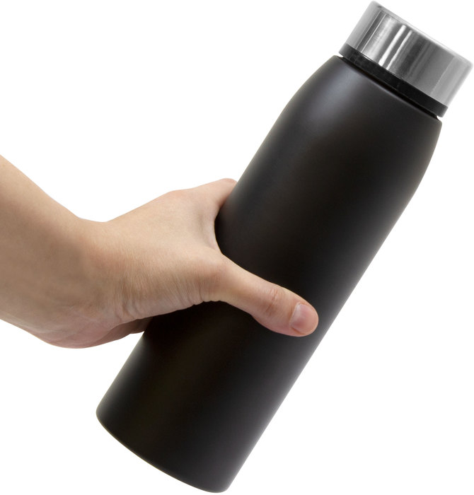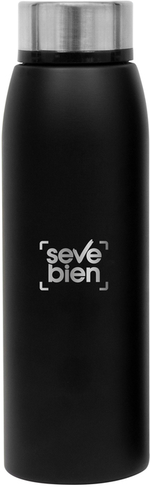 Ø 7 x 23,5 cm. Capacidad 500 ml. Botella doble pared, sellada al vacío. Interior de acero 304 y exterior de acero 201. Cuerpo color negro y tapa a rosca de acero. Mantiene hasta 12 hs la temperatura de las bebidas calientes y 24 hs de las bebidas frías. Presentación en caja de regalo.