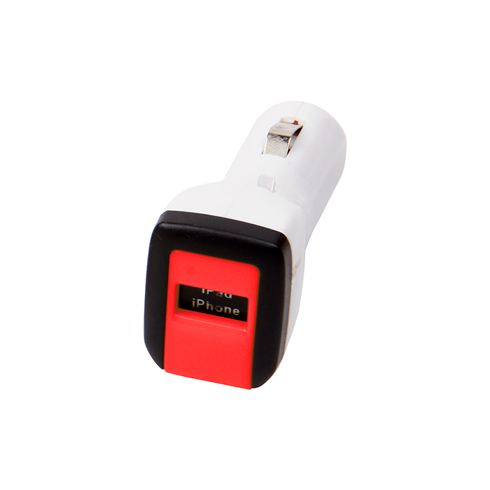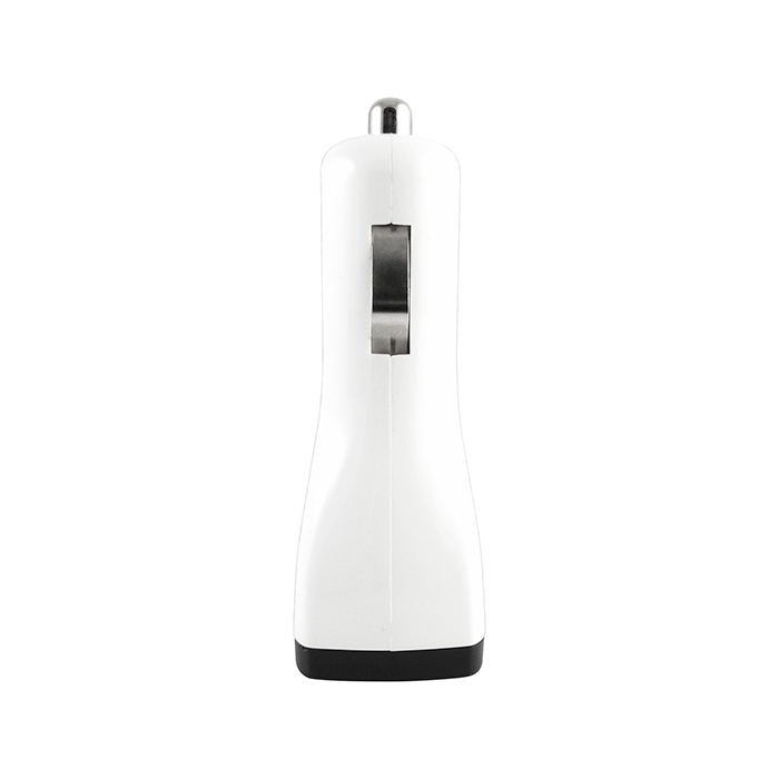 Cargador de auto para dispositivos móviles con 2 salidas, fabricado en material ABS. Incluye caja individual.