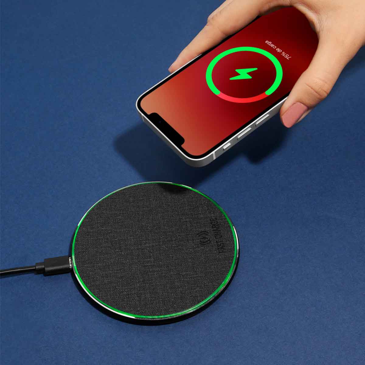 Cargador inalámbrico «fast charge». Velocidad de carga: 5W / 7.5W / 10W / 15W. Se enciende luz color verde cuando está en reposo y luz color azul cuando está en proceso de carga. Incluye cable auxiliar tipo C y caja individual.
