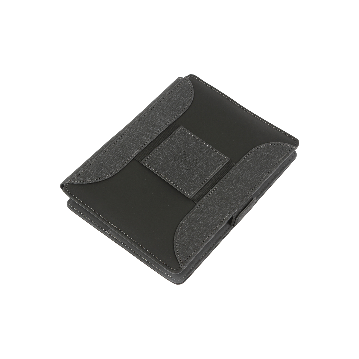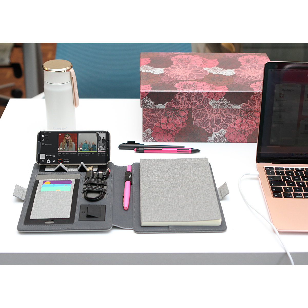 Carpeta con cargador inalámbrico y power bank de 6,000 mAh, con compartimentos para almacenaje, porta plumas y tarjetero, sujetadores de cables y base para teléfono móvil. Libreta con hojas rayadas y broches de seguridad.