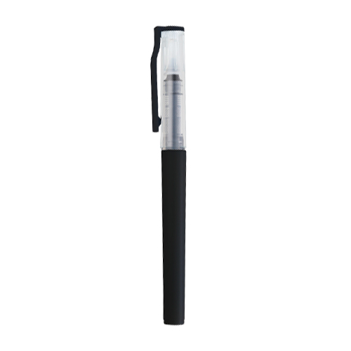 Bolígrafo de plástico con tinta negra de gel, tapa traslúcida y clip de plástico.