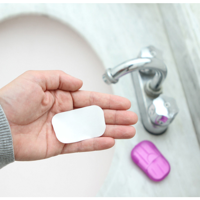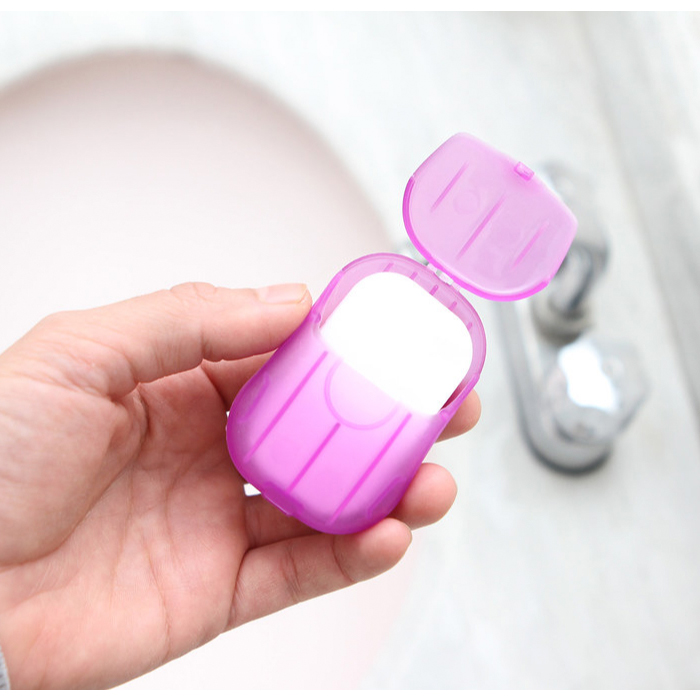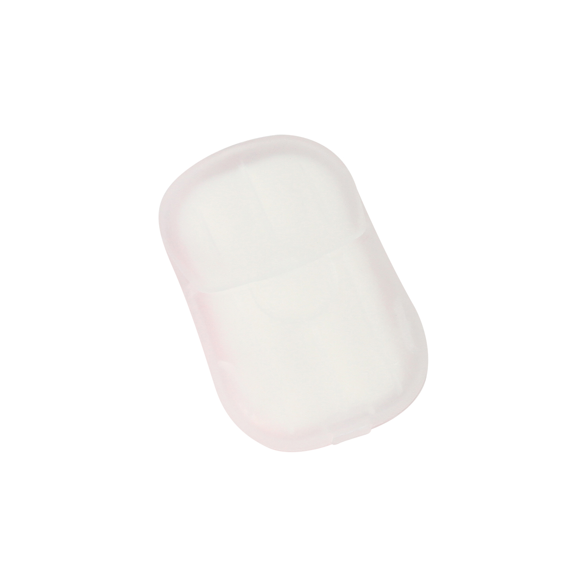Contenedor portátil fabricado en plástico PP (Polipropileno) translucido, con 20 láminas de jabón de desinfección que es suave para la piel y no causa resequedad. Ideal para llevarlas contigo a cualquier lugar.