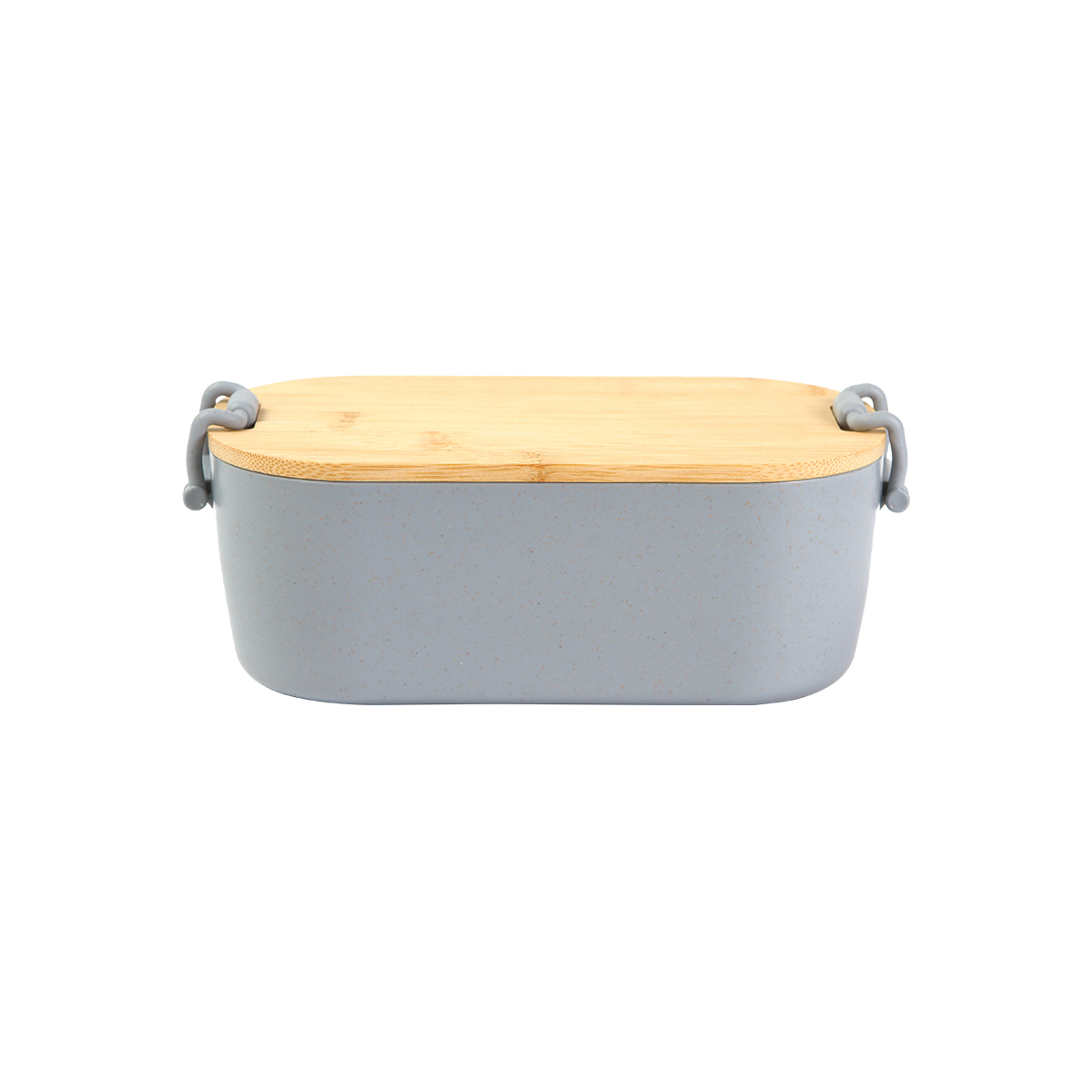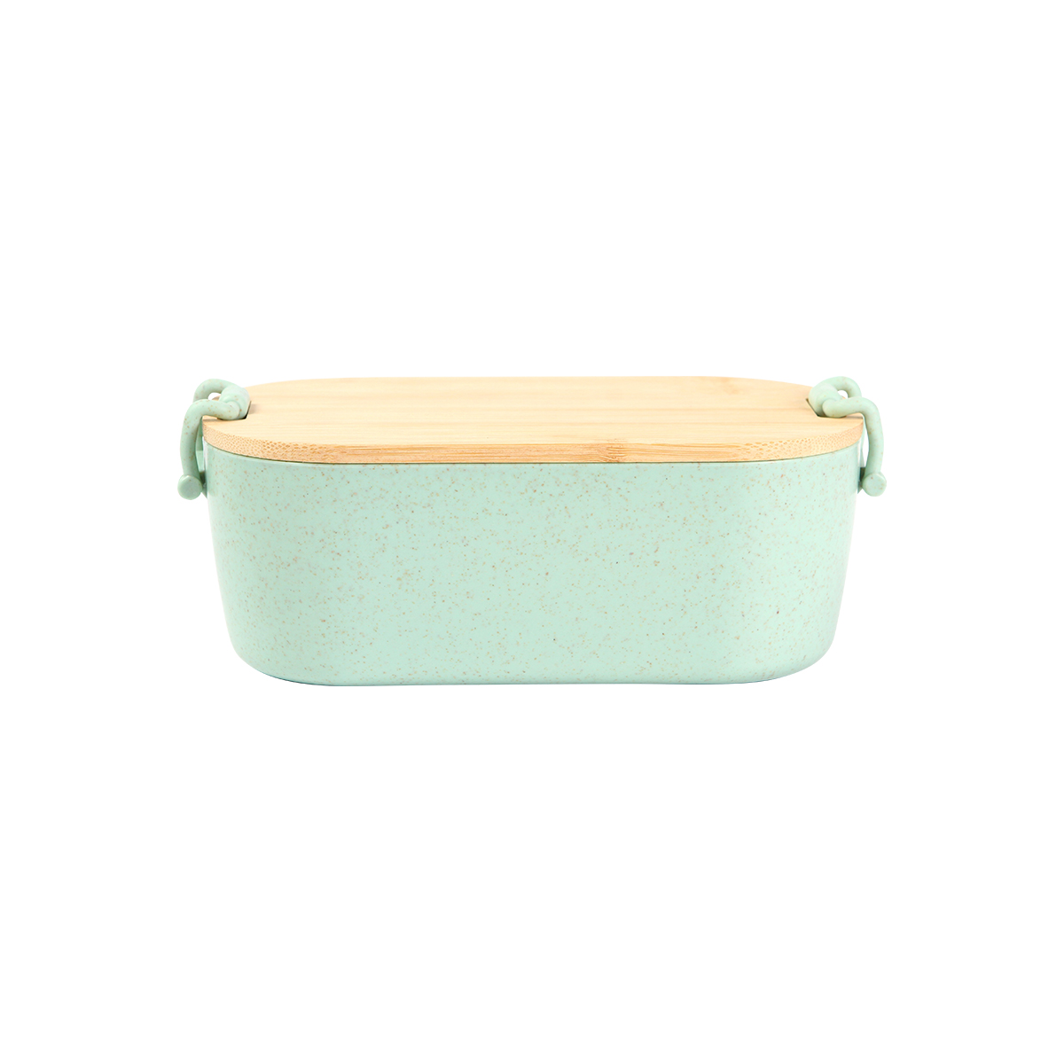 Contenedor de alimentos fabricado en polipropileno (PP) y fibra trigo, con tapa de madera de bambú. Capacidad de 1,000 ml. Incluye tenedor y envase pequeño para alimentos.