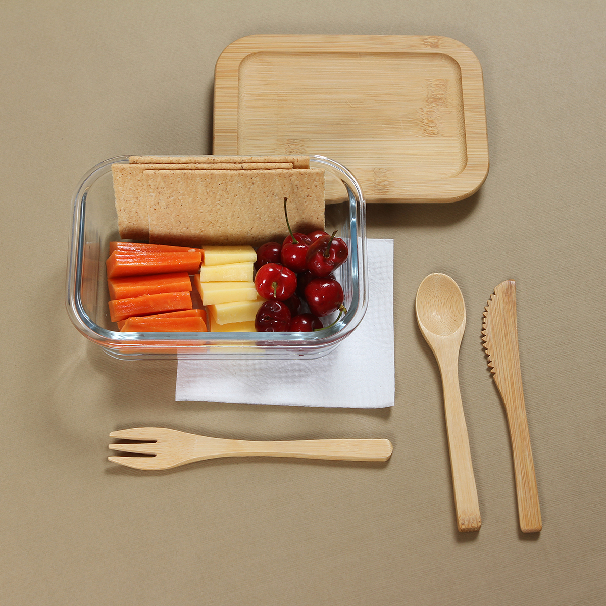 Contenedor para alimentos fabricado en vidrio, que garantiza la conservación adecuada de los alimentos, con banda elástica y tapa que se ajusta de forma segura al contenedor, cubiertos de bambú, incluye tenedor, cuchara y cuchillo.