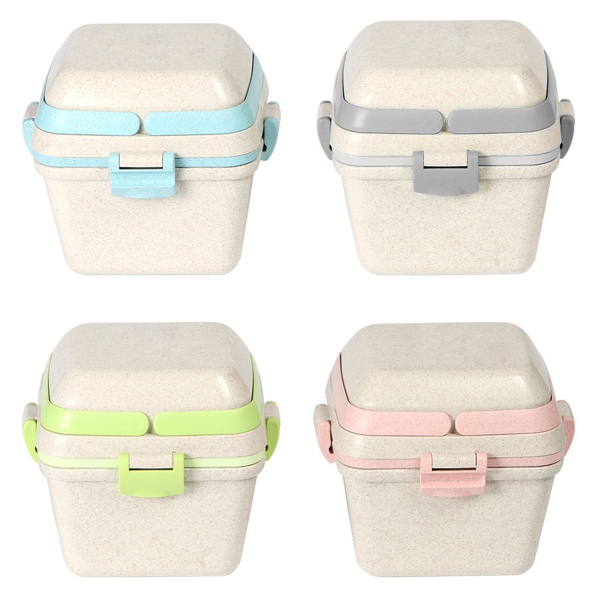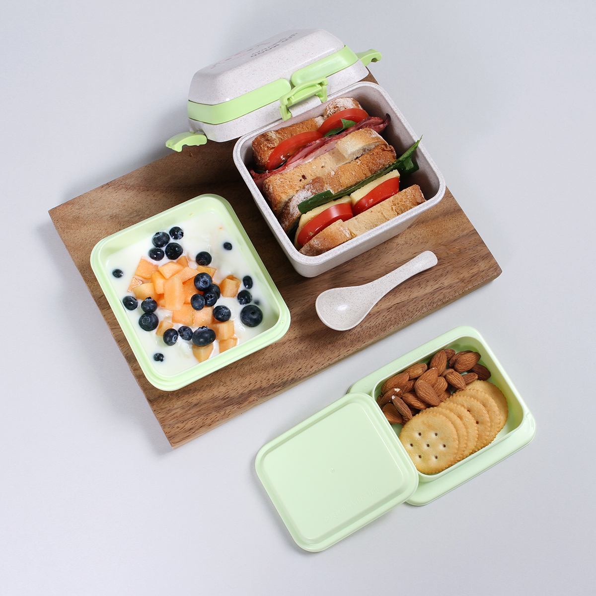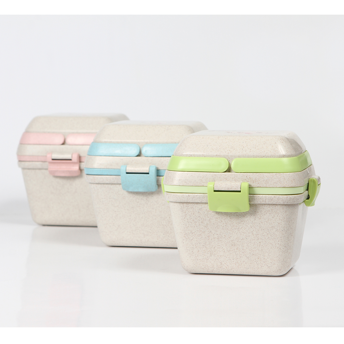 Contenedor para alimentos fabricado en fibra de trigo con PP (Polipropileno). Con 3 compartimentos (650+350+150 ml) , asas superiores, clips de seguridad y cuchara.