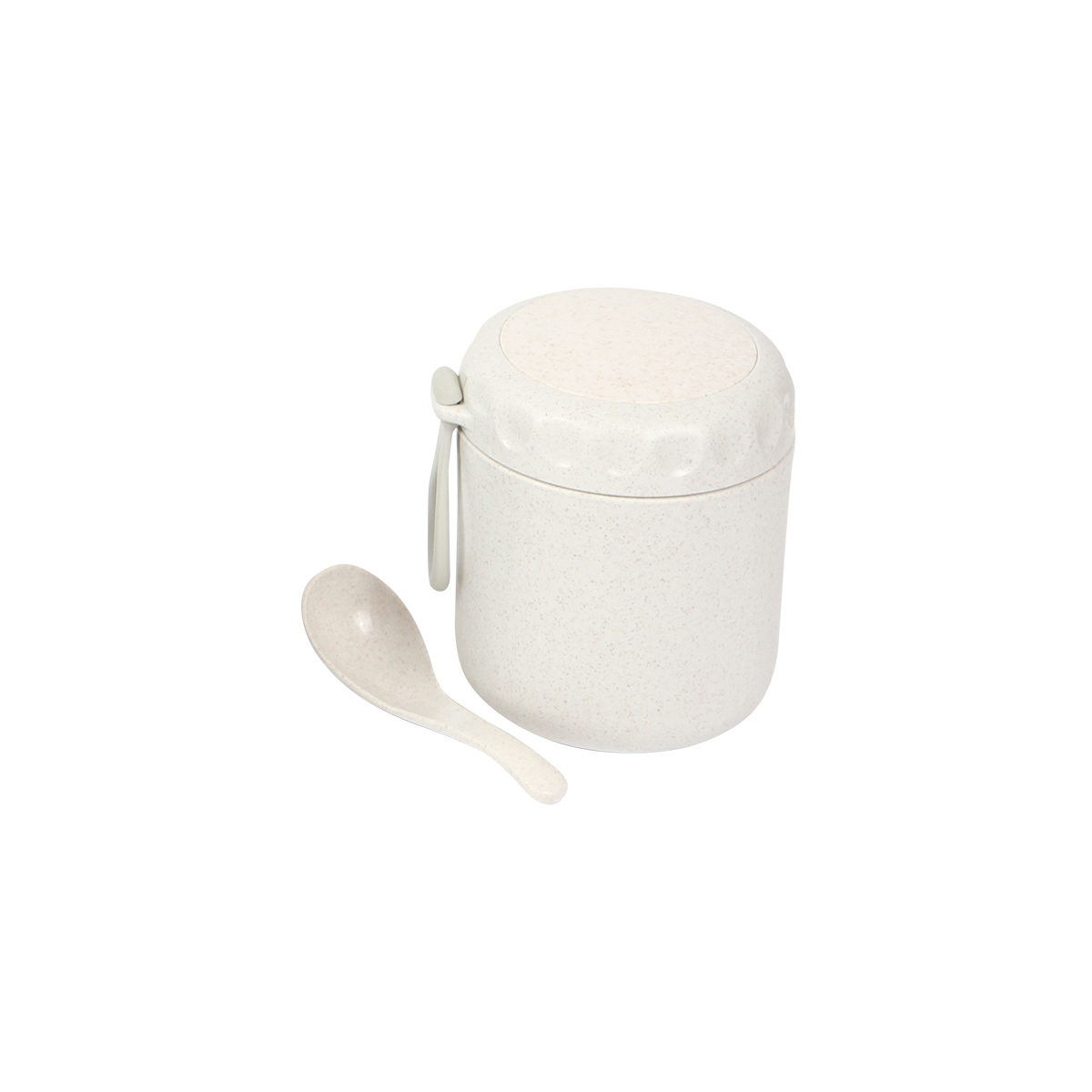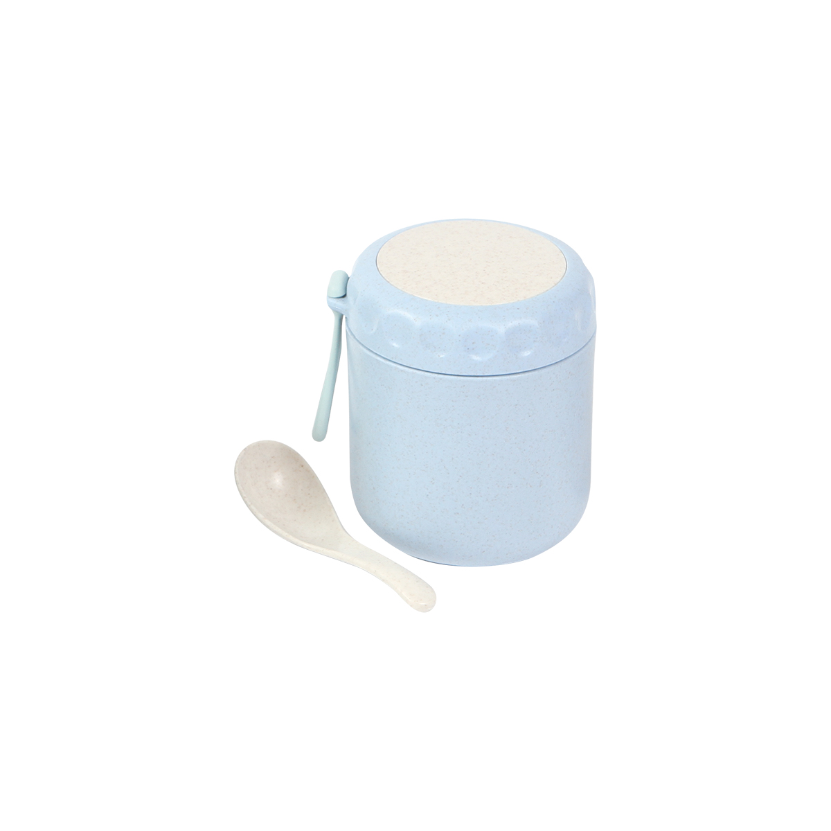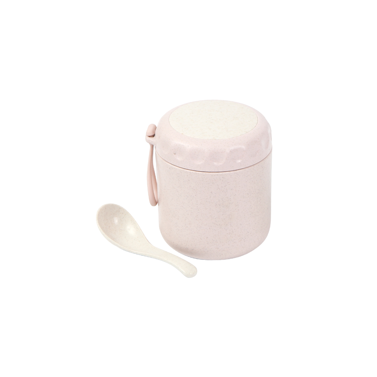 Contenedor de alimentos fabricado en polipropileno (PP) y fibra de trigo. Incluye cuchara y correa. Capacidad 380 ml.