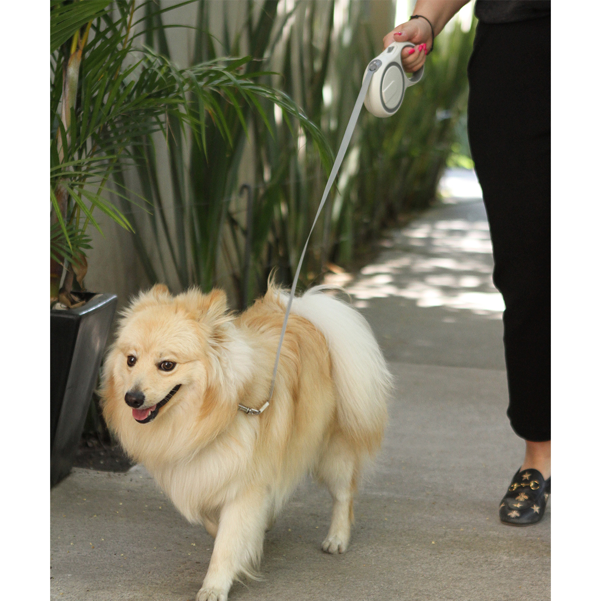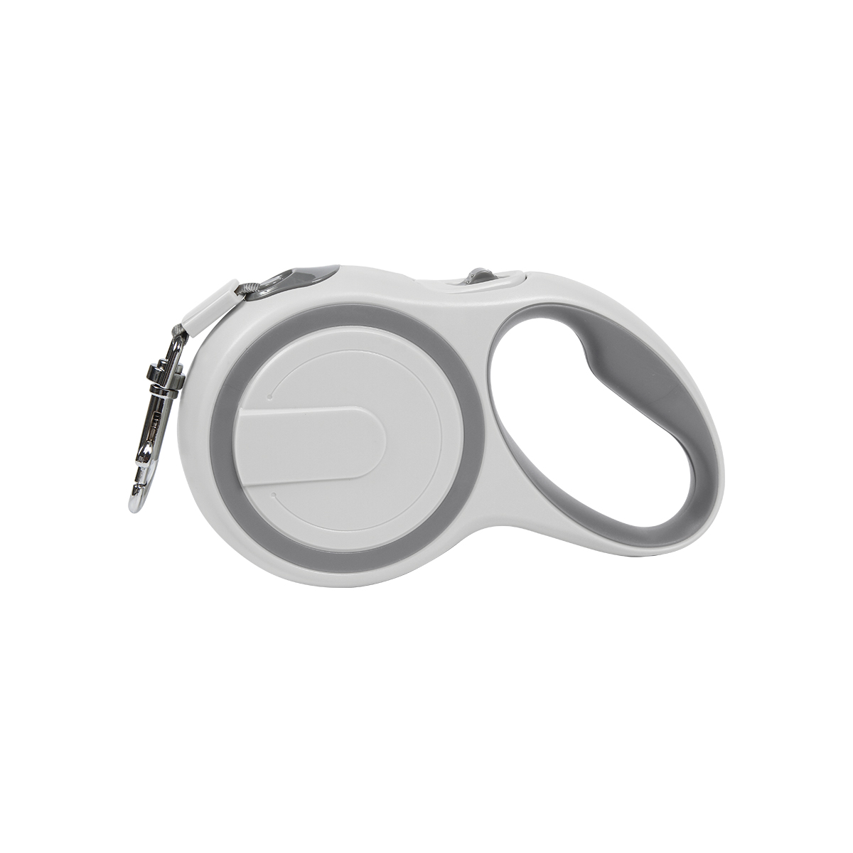 Correa retráctil de 5 metros, fabricada en plástico ASB + TPE (elastómero termoplástico), con seguro fiable de bloqueo para fijar la cinta con un botón, con mango antideslizante. Incluye caja de cartón individual.