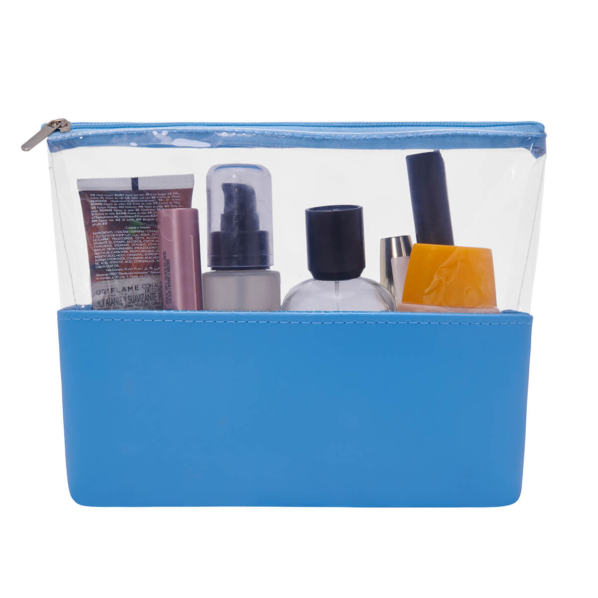 Cosmetiquera con cierre. Diseño combinado de PVC transparente y curpiel de color en base.