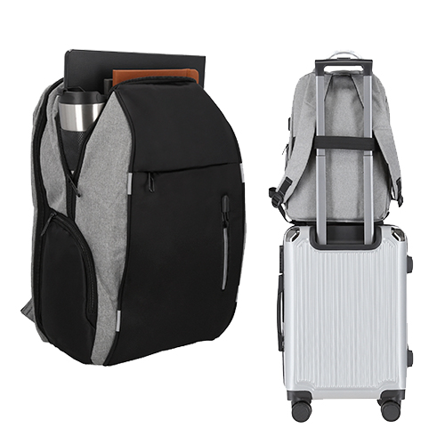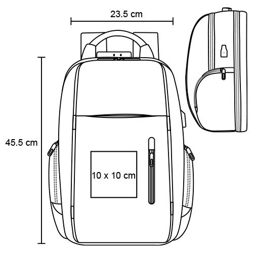 Mochila de seguridad con 2 compartimentos, porta laptop de 18″, 2 compartimentos laterales, 2 compartimentos frontales, asa de aluminio, candado de seguridad y puerto de carga USB.