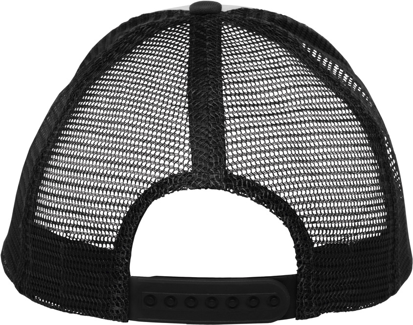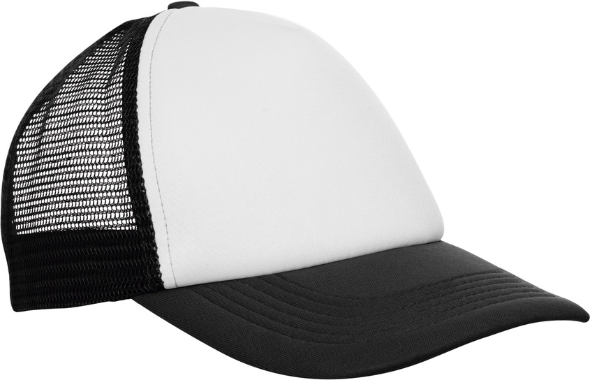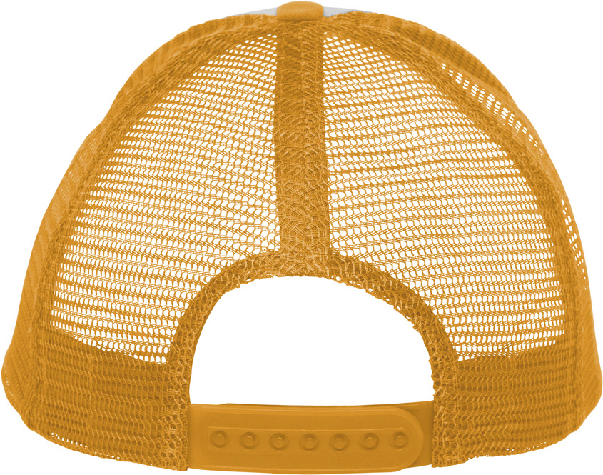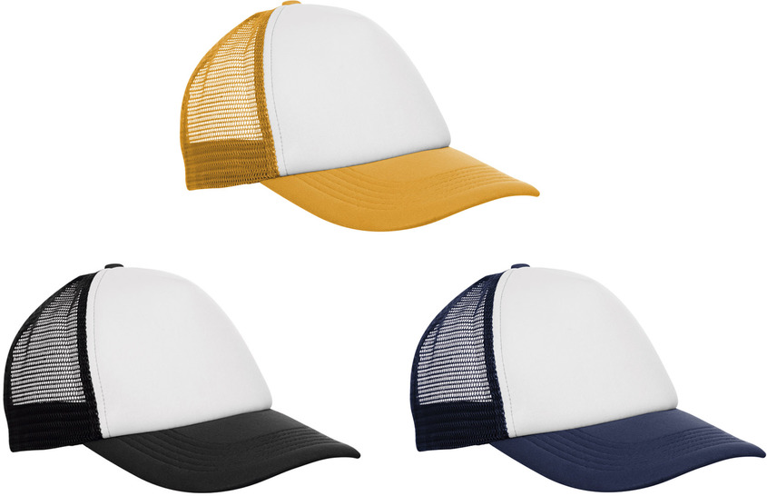 Ancho de base 18 cm. x alto 16 cm. Poliéster. Gorra trucker 5 gajos. Frente de color blanco. Parte trasera con tela red de color. Ajuste con broche plástico. Seis costuras 17,5 x 7,5 cm.
