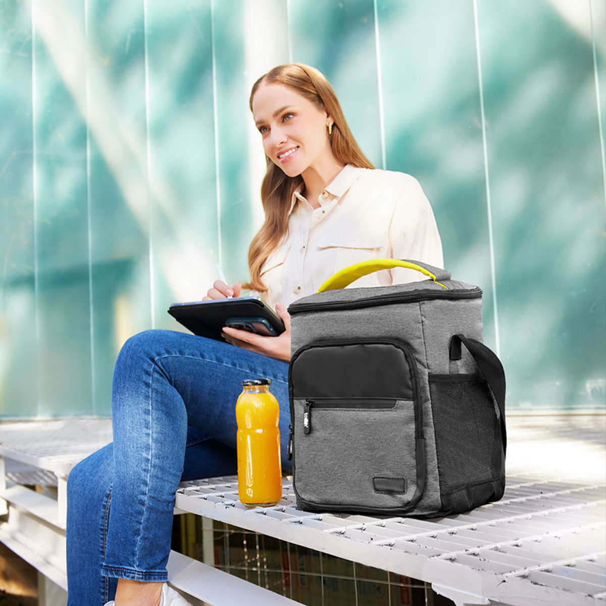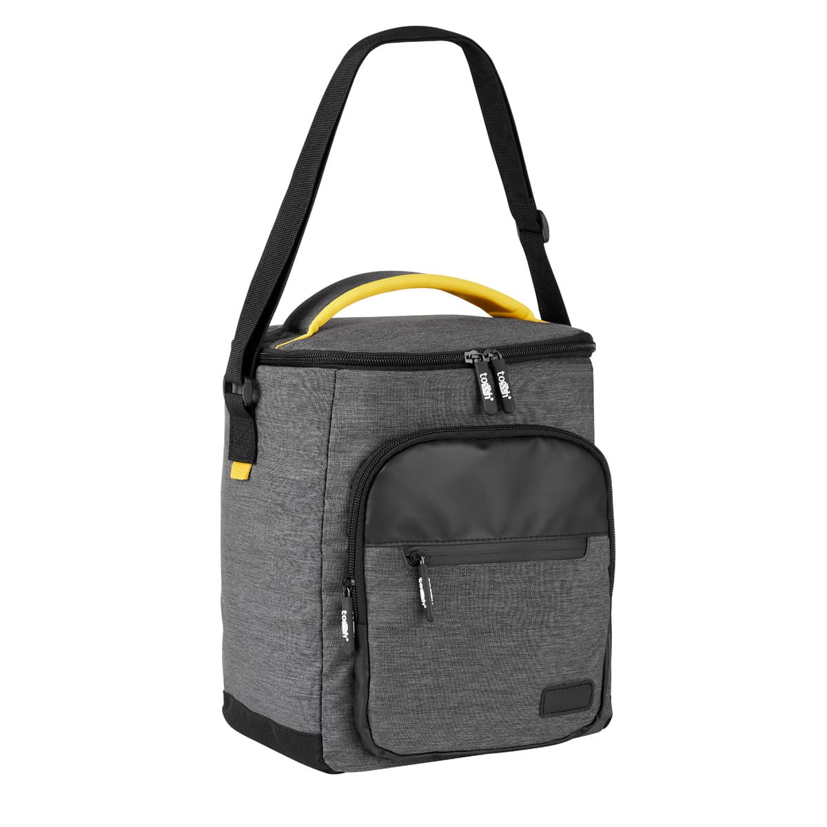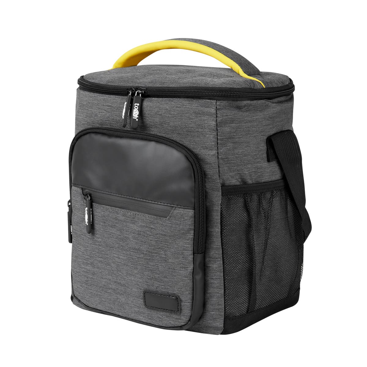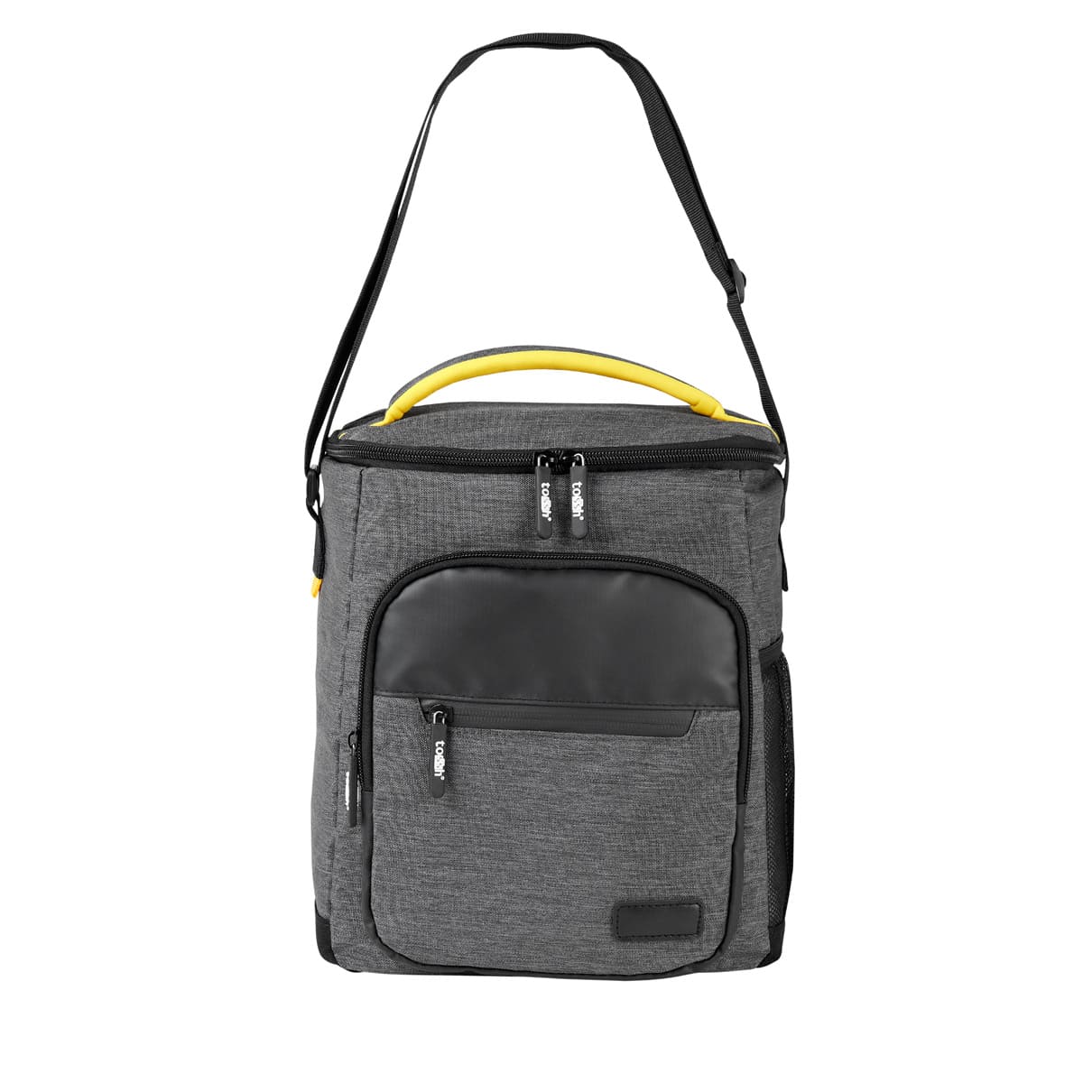 Hielera con interior plastificado y sellado. Doble bolsillo frontal con cierre, bolsillo lateral de malla, incluye asa superior acolchada y correa ajustable.