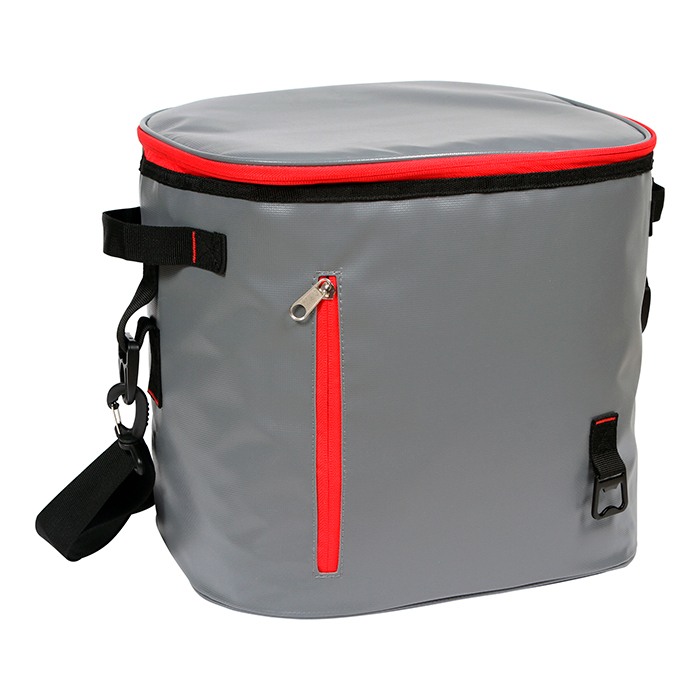 Hielera fabricada en PVC (lona) con destapador y compartimiento en el lado frontal, con correa ajustable y retirable, con asas en los costados para mayor comodidad al momento de transportar, cuenta con detalles de color en los cierres.