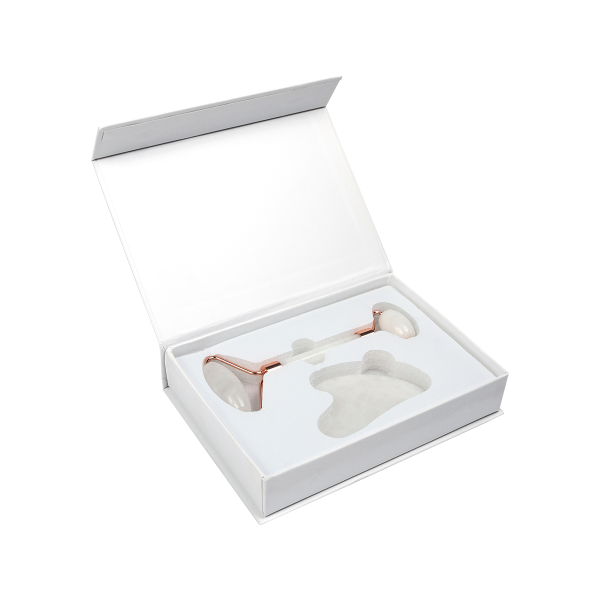 Juego de masajeadores para el rostro que incluye un rodillo fabricado en cuarzo blanco y acero con terminado rose gold, 1 gua-sha de cuarzo blanco, y una caja para regalo con suaje. La piedra de cuarzo blanco tiene propiedades calmantes y refrescantes para la piel, este producto ayuda a mejorar la circulación, reducir la hinchazón y promover un cutis más radiante. Este juego te ofrece una oportunidad única de mimarte y cuidar de tu piel de una manera lujosa y relajante. Es perfecto para aquellos que buscan una rutina de cuidado facial efectiva, holística y elegante.