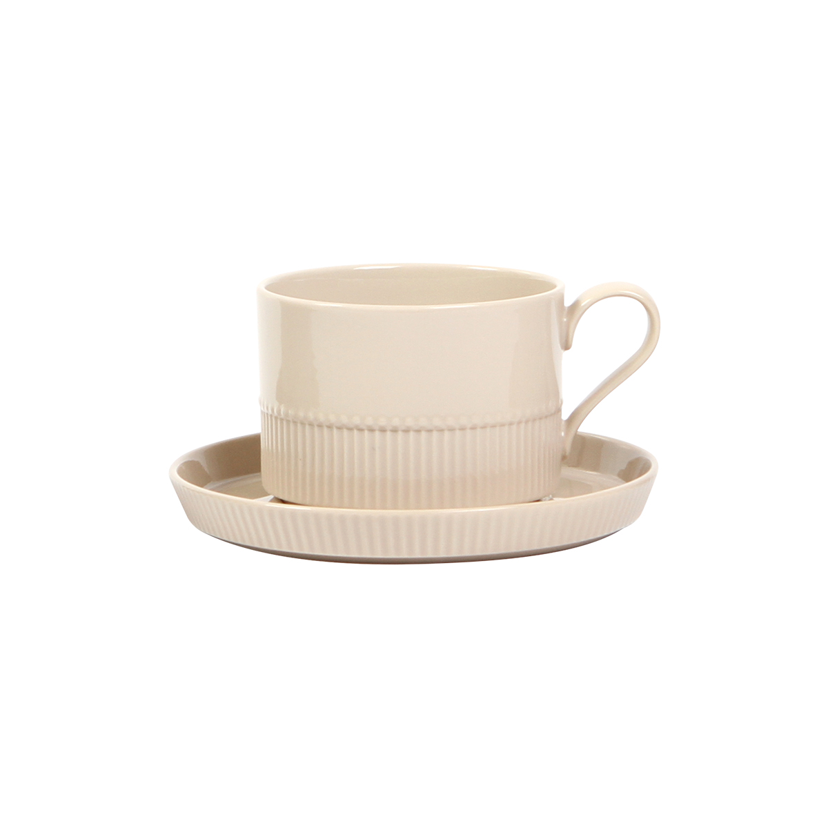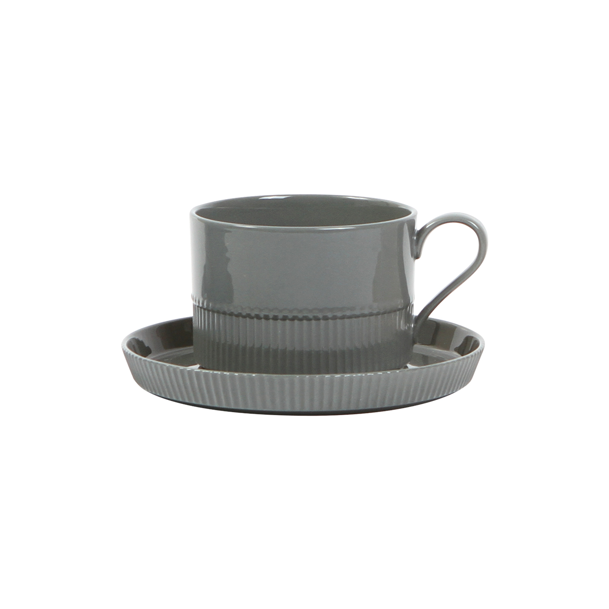 Juego de té, incluye taza con plato fabricados en porcelana, con detalle en rayas y diseño glowy.