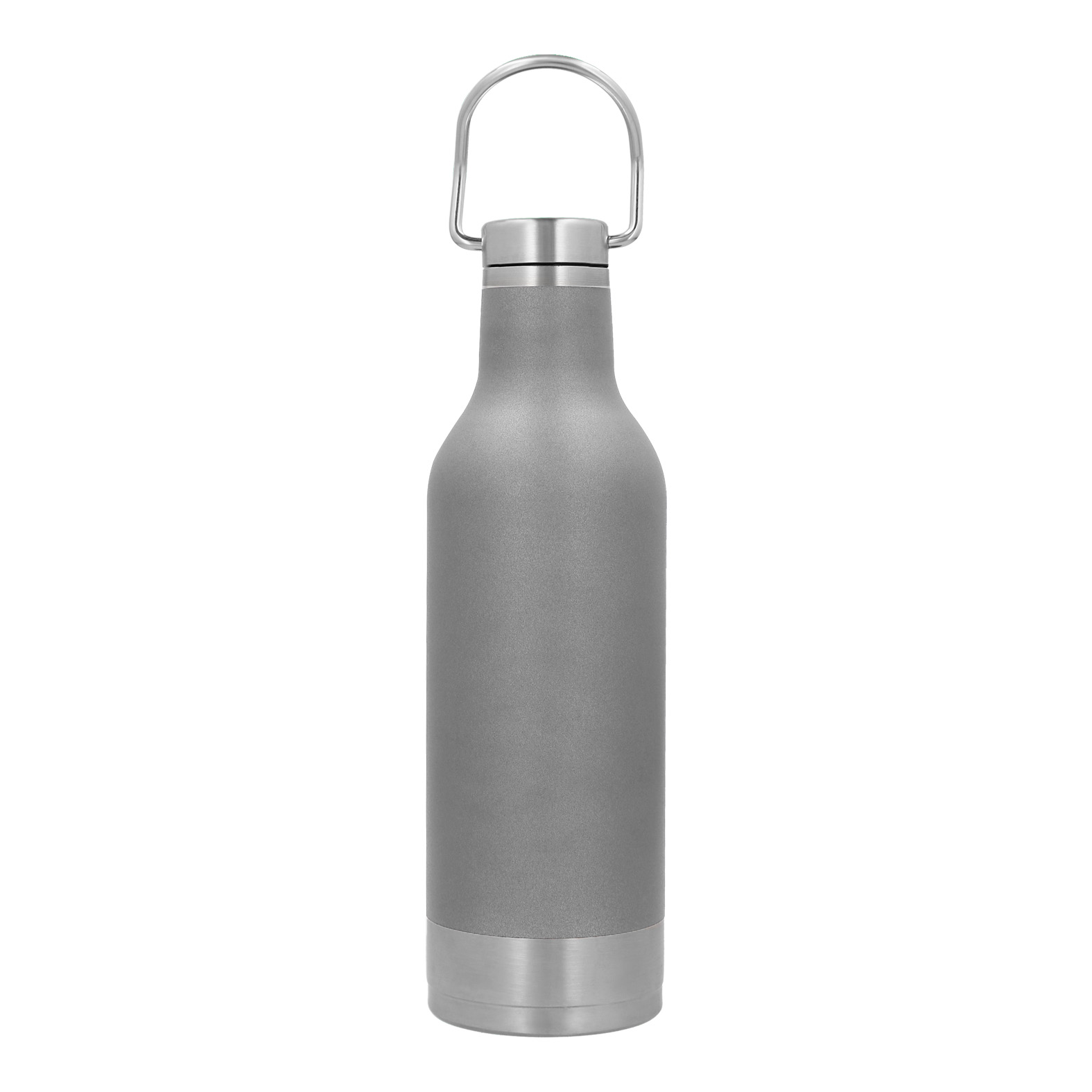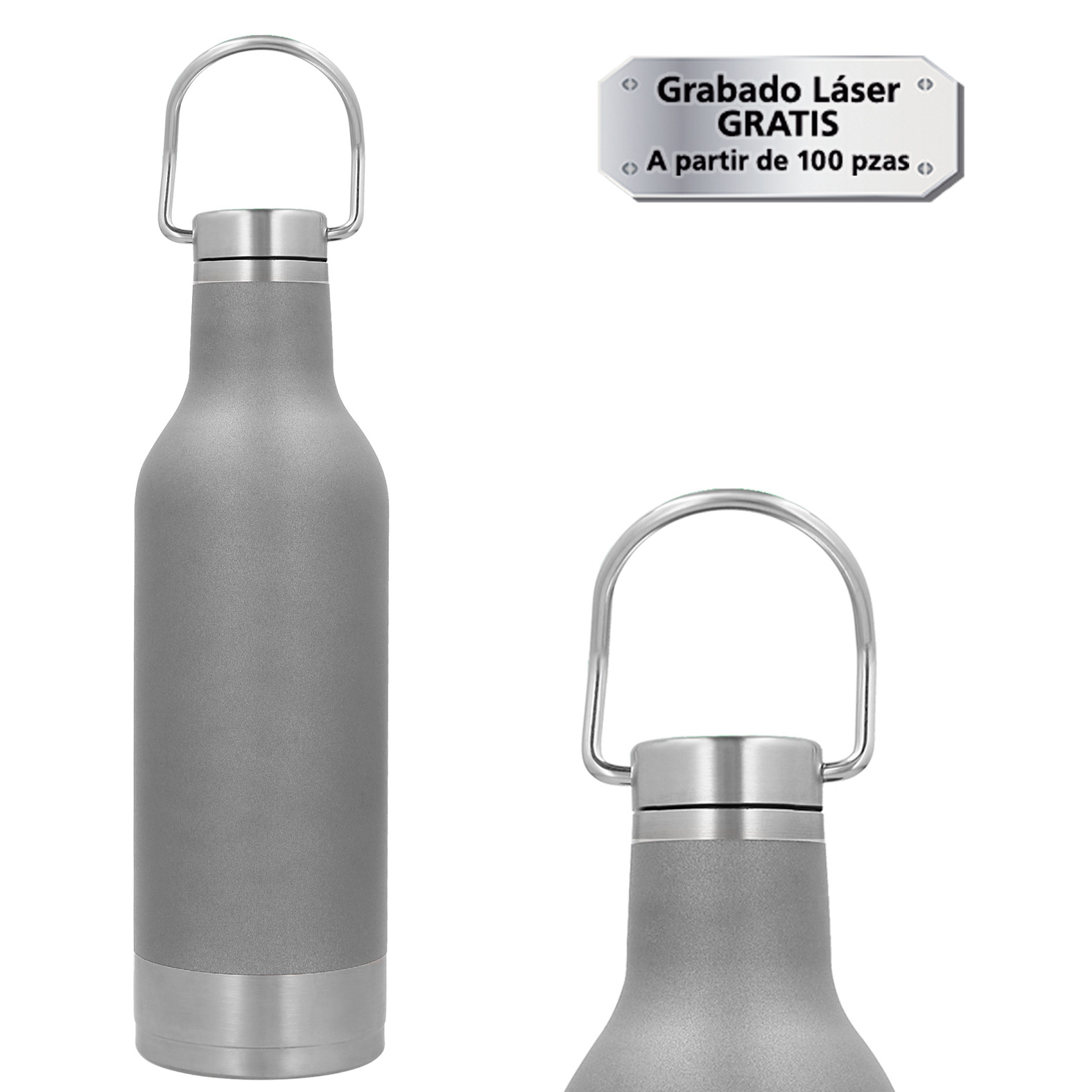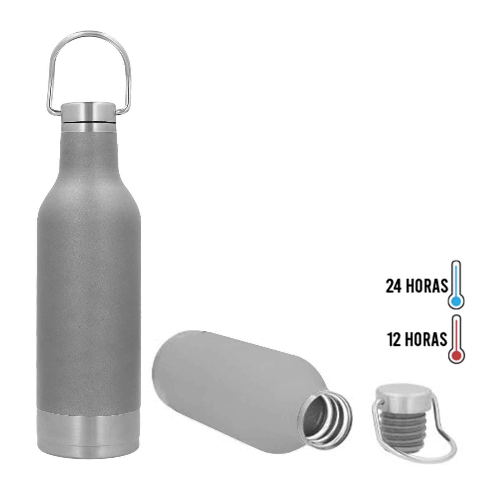Termo con doble pared de acero inoxidable, tapa con asa metálica enroscable y base de metal.