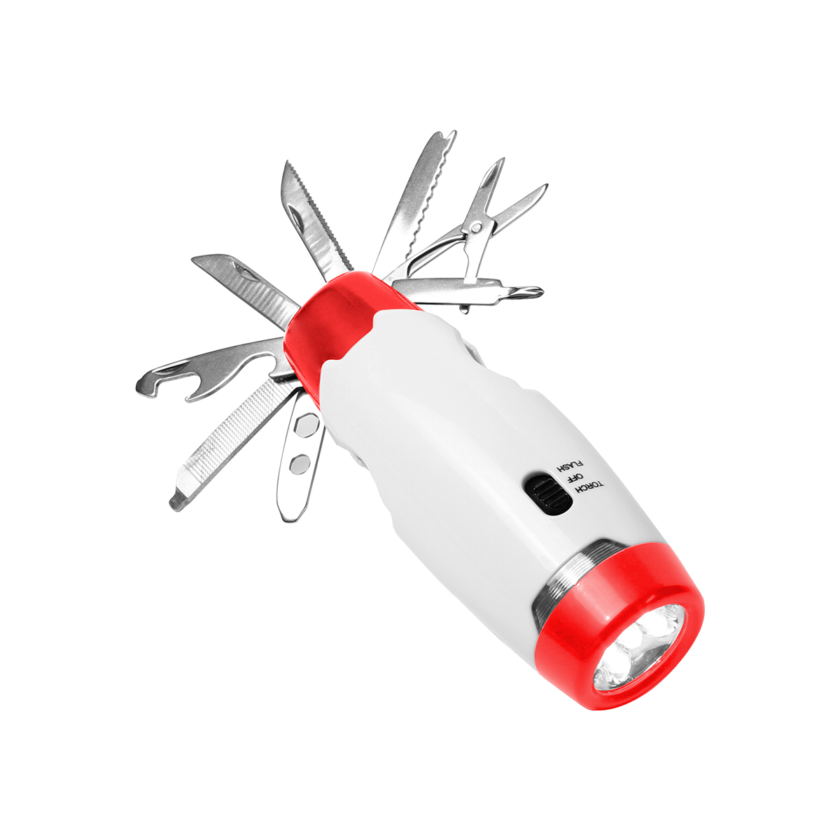 Lámpara con luz led, herramienta con 8 funciones, estuche individual y baterías incluidas.
