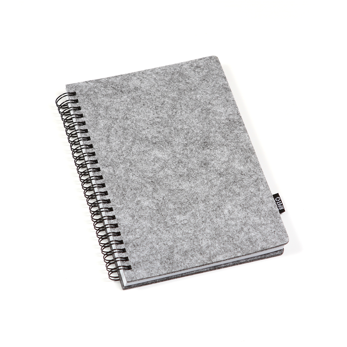 Libreta con espiral fabricada en RPET, porta pluma, tamaño A5 con 80 hojas de 70 gramos cada una y páginas blancas rayadas.